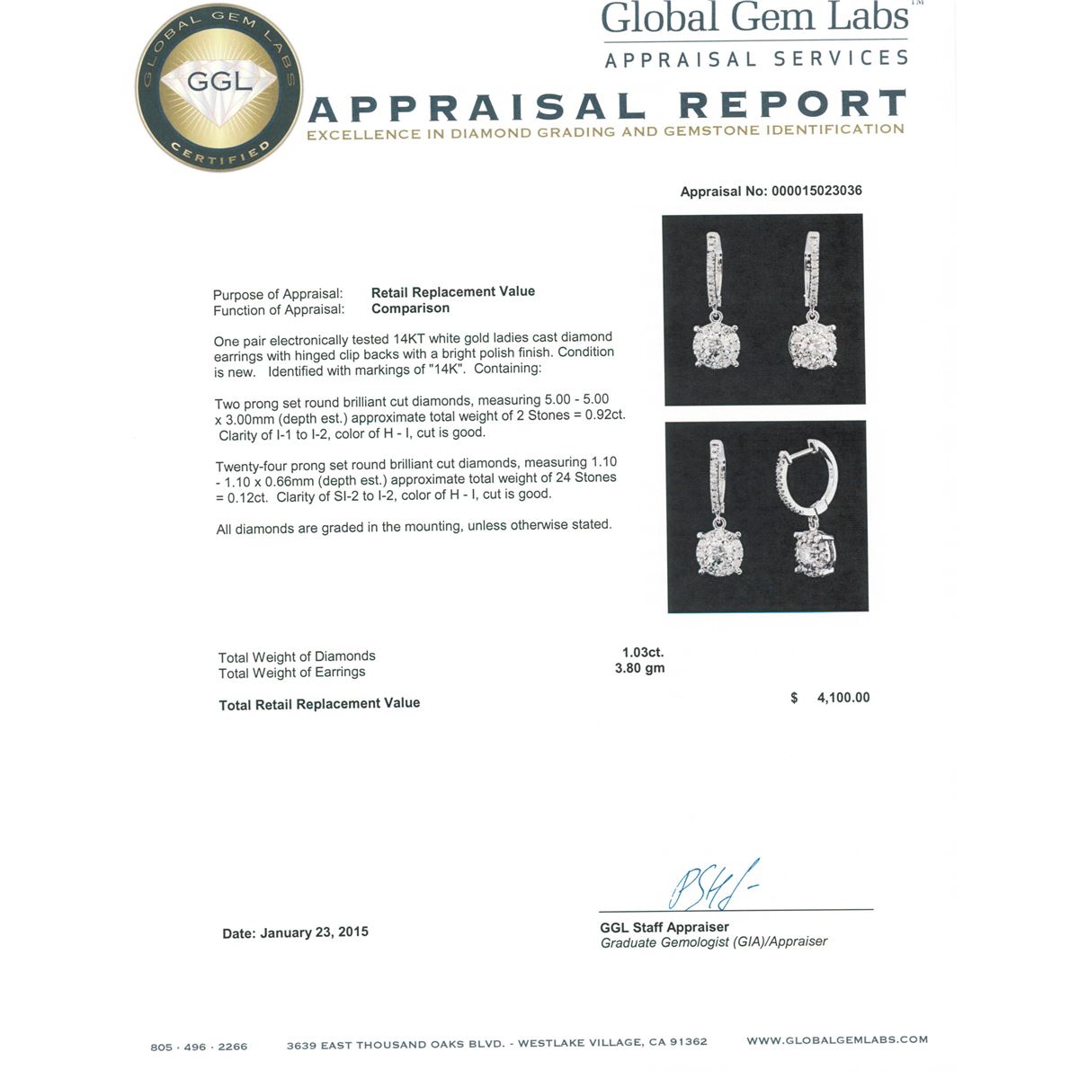 One pair electronically tested 14KT white gold ladies cast diamond earrings with hinged clip backs with a bright polish finish. Identified with markings of "14K". Condition is new. Containing: Two prong set round brilliant cut diamonds, measuring 5.00 - 5.00 x 3.00mm (depth est.) approximate total weight of 2 Stones = 0.92ct. Clarity: I-1 to I-2. Color: H - I, Cut is Good. Twenty-Four prong set round brilliant cut diamonds, measuring 1.10 - 1.10 x 0.66mm (depth est.) approximate total weight of 24 Stones = 0.12ct. Clarity: SI-2 to I-2. Color: H - I, Cut is Good. All diamonds are graded in the mounting, unless otherwise stated. Total Weight of Diamonds 1.03ct. Total Weight of Earrings 3.80 grams. GGL Appraised at $4,100.00.