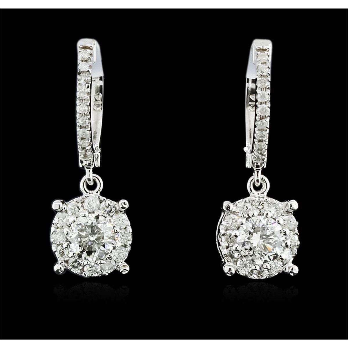 One pair electronically tested 14KT white gold ladies cast diamond earrings with hinged clip backs with a bright polish finish. Identified with markings of "14K". Condition is new. Containing: Two prong set round brilliant cut diamonds, measuring 5.00 - 5.00 x 3.00mm (depth est.) approximate total weight of 2 Stones = 0.92ct. Clarity: I-1 to I-2. Color: H - I, Cut is Good. Twenty-Four prong set round brilliant cut diamonds, measuring 1.10 - 1.10 x 0.66mm (depth est.) approximate total weight of 24 Stones = 0.12ct. Clarity: SI-2 to I-2. Color: H - I, Cut is Good. All diamonds are graded in the mounting, unless otherwise stated. Total Weight of Diamonds 1.03ct. Total Weight of Earrings 3.80 grams. GGL Appraised at $4,100.00.