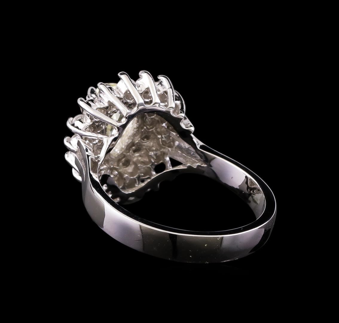 One electronically tested 14KT white gold ladies combination cast & assembled engagement ring with a flat shank with a bright polish finish. Identified with markings of "14K". Condition is new. Containing: One prong set pear shaped cut diamond, measuring 8.50 x 4.70 x 2.51mm (depth est.) approximate weight of 0.58ct. Clarity: SI-2, Cut is Good. Thirty-One prong set round brilliant cut diamonds, measuring 1.80 - 1.40 x 0.96mm (depth est.) approximate total weight of 31 Stones = 0.46ct. Clarity: SI-1 to SI-2. Color: G - H, Cut is Good. All diamonds are graded in the mounting, unless otherwise stated. Total Weight of Diamonds 1.04ct. Total Weight of Ring 5.30 grams. GGL Appraised.
