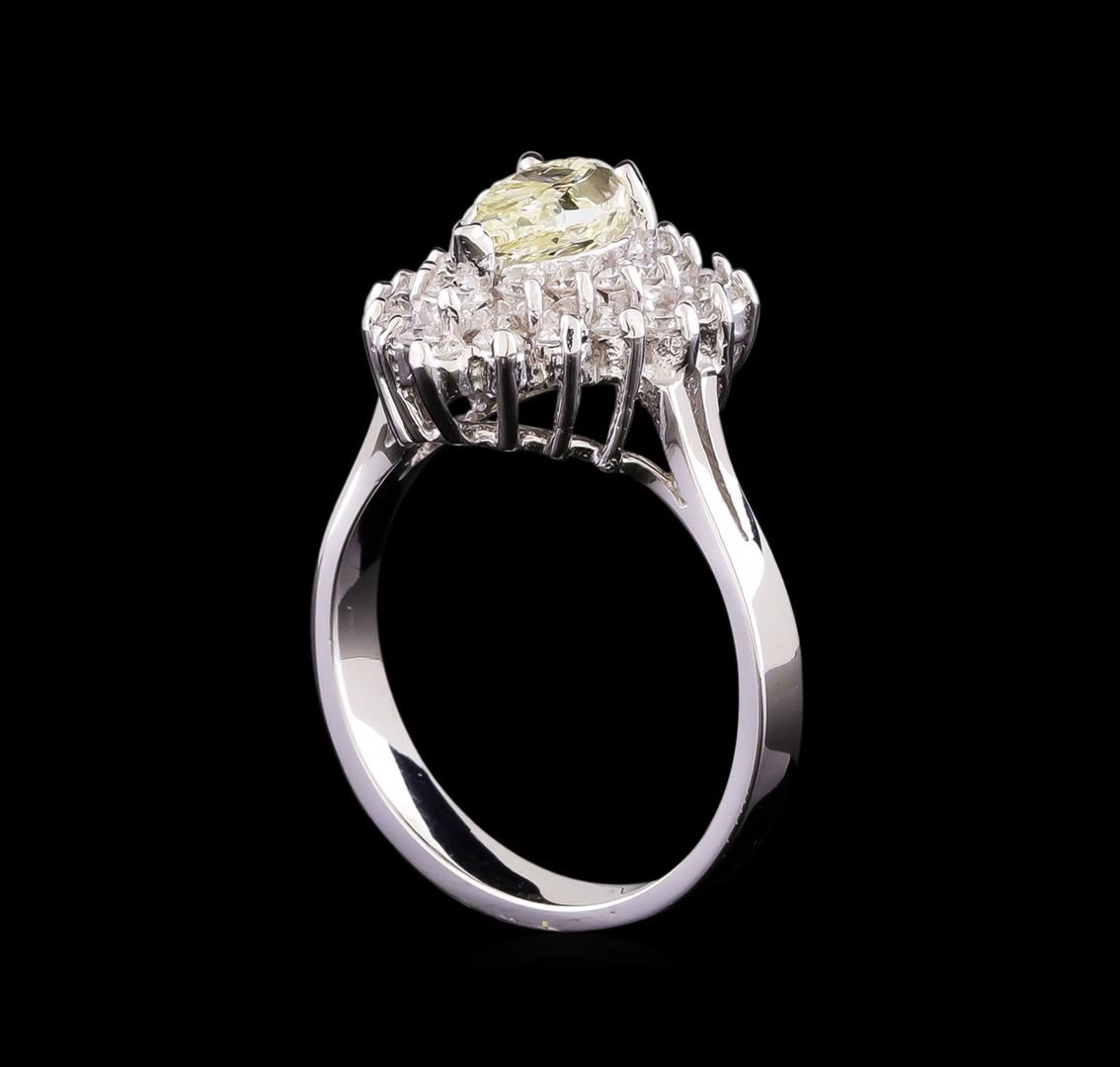 One electronically tested 14KT white gold ladies combination cast & assembled engagement ring with a flat shank with a bright polish finish. Identified with markings of "14K". Condition is new. Containing: One prong set pear shaped cut diamond, measuring 8.50 x 4.70 x 2.51mm (depth est.) approximate weight of 0.58ct. Clarity: SI-2, Cut is Good. Thirty-One prong set round brilliant cut diamonds, measuring 1.80 - 1.40 x 0.96mm (depth est.) approximate total weight of 31 Stones = 0.46ct. Clarity: SI-1 to SI-2. Color: G - H, Cut is Good. All diamonds are graded in the mounting, unless otherwise stated. Total Weight of Diamonds 1.04ct. Total Weight of Ring 5.30 grams. GGL Appraised.