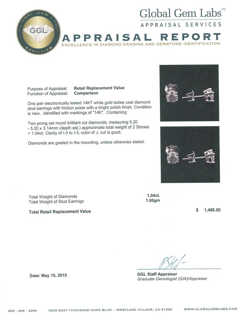 One pair electronically tested 14KT white gold ladies cast diamond stud earrings with friction posts with a bright polish finish. Identified with markings of "14K". Condition is new. Containing: Two prong set round brilliant cut diamonds, measuring 5.20 - 5.20 x 3.14mm (depth est.) approximate total weight of 2 Stones = 1.04ct. Clarity: I-3 to I-3. Color: J, Cut is Good. Diamonds are graded in the mounting, unless otherwise stated. Total Weight of Diamonds 1.04ct. Total Weight of Stud Earrings 1.00 grams. GGL Appraised at $1,490.00.