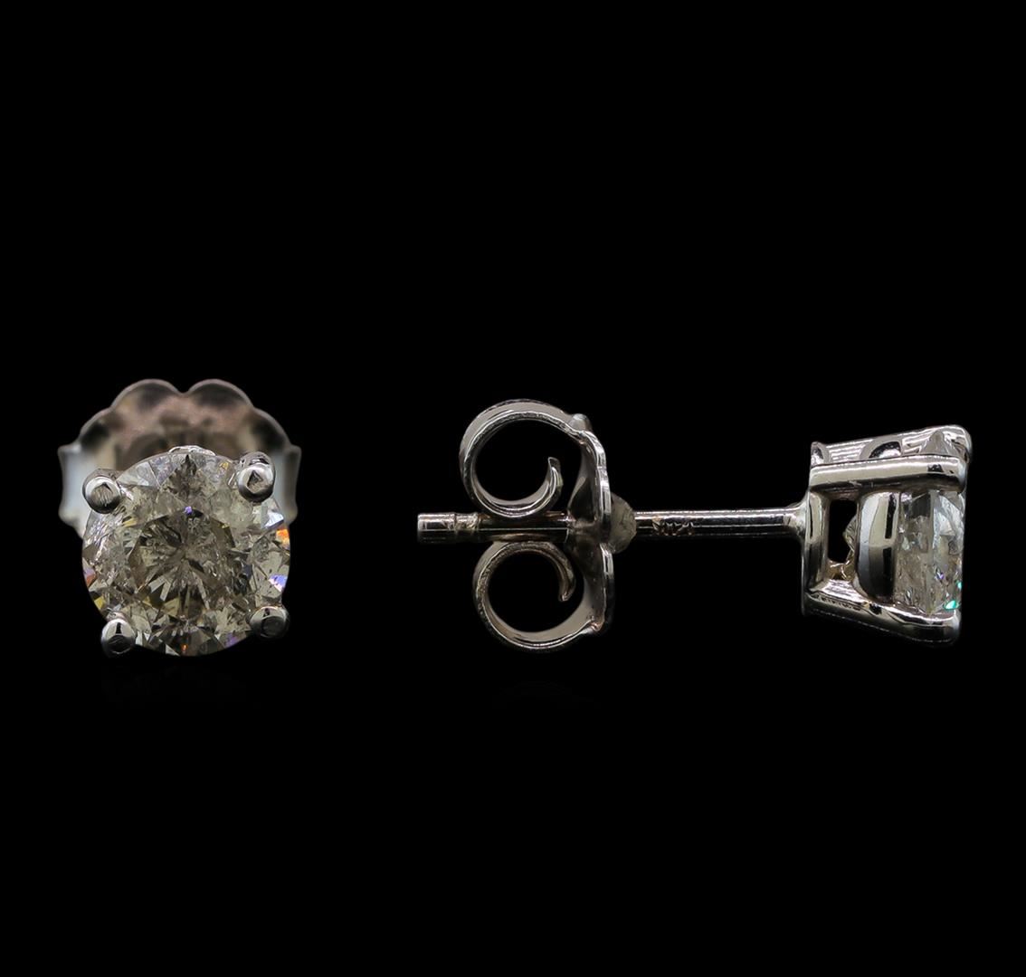 One pair electronically tested 14KT white gold ladies cast diamond stud earrings with friction posts with a bright polish finish. Identified with markings of "14K". Condition is new. Containing: Two prong set round brilliant cut diamonds, measuring 5.20 - 5.20 x 3.14mm (depth est.) approximate total weight of 2 Stones = 1.04ct. Clarity: I-3 to I-3. Color: J, Cut is Good. Diamonds are graded in the mounting, unless otherwise stated. Total Weight of Diamonds 1.04ct. Total Weight of Stud Earrings 1.00 grams. GGL Appraised at $1,490.00.