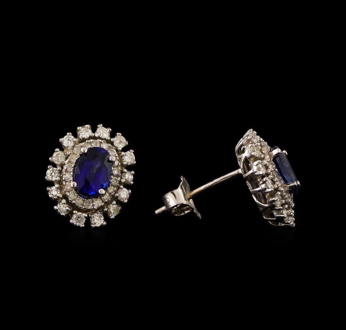 One pair electronically tested 14KT white gold ladies cast sapphire and diamond earrings with friction posts with a bright polish finish. Identified with markings of "K14". Condition is new. Containing: Two prong set oval modified brilliant cut natural blue sapphires, measuring 6.00 x 4.00 x 2.60mm, approximate total weight of 1.04ct., clarity is slightly included, type II, medium, moderately strong, blue color, (GIA B 5/4), cut is good. Sixty-Four prong set round brilliant cut diamonds, measuring 1.50 - 1.00 x 0.75mm (depth est.) approximate total weight of 64 Stones = 0.30ct. Clarity: SI-2 to I-1. Color: I - J, Cut is Good. Colored gemstones are presumed to have been subjected to commonly used enhancement processes. All diamonds and colored gemstones are graded in the mounting, unless otherwise stated. Total Weight of Colored Stones 1.04ct. Total Weight of Diamonds 0.30ct. Total Weight of Earrings 2.70 grams. GGL Appraised at $2,410.00.