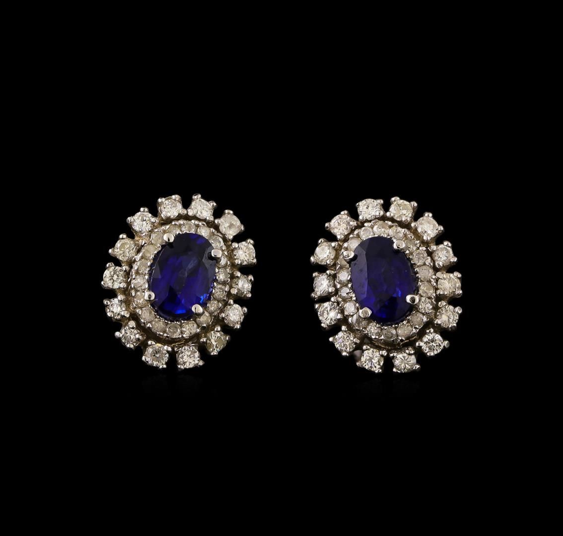 One pair electronically tested 14KT white gold ladies cast sapphire and diamond earrings with friction posts with a bright polish finish. Identified with markings of "K14". Condition is new. Containing: Two prong set oval modified brilliant cut natural blue sapphires, measuring 6.00 x 4.00 x 2.60mm, approximate total weight of 1.04ct., clarity is slightly included, type II, medium, moderately strong, blue color, (GIA B 5/4), cut is good. Sixty-Four prong set round brilliant cut diamonds, measuring 1.50 - 1.00 x 0.75mm (depth est.) approximate total weight of 64 Stones = 0.30ct. Clarity: SI-2 to I-1. Color: I - J, Cut is Good. Colored gemstones are presumed to have been subjected to commonly used enhancement processes. All diamonds and colored gemstones are graded in the mounting, unless otherwise stated. Total Weight of Colored Stones 1.04ct. Total Weight of Diamonds 0.30ct. Total Weight of Earrings 2.70 grams. GGL Appraised at $2,410.00.