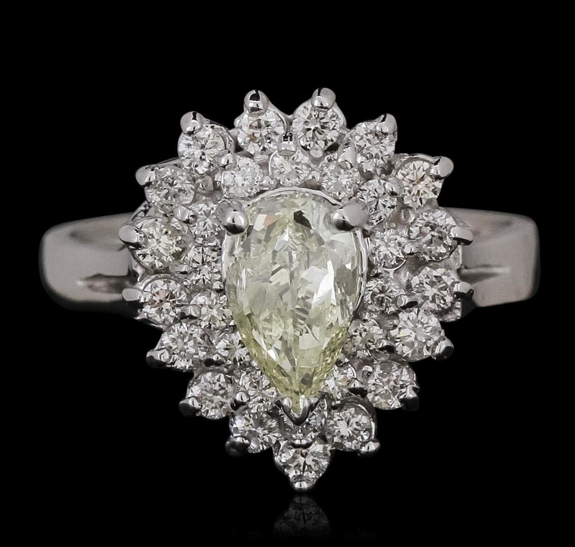 One electronically tested 14KT white gold ladies combination cast & assembled engagement ring with a flat shank with a bright polish finish. Identified with markings of "14K". Condition is new. Containing: One prong set pear shaped cut diamond, measuring 8.50 x 4.70 x 2.51mm (depth est.) approximate weight of 0.58ct. Clarity: SI-2, Cut is Good. Thirty-One prong set round brilliant cut diamonds, measuring 1.80 - 1.40 x 0.96mm (depth est.) approximate total weight of 31 Stones = 0.46ct. Clarity: SI-1 to SI-2. Color: G - H, Cut is Good. All diamonds are graded in the mounting, unless otherwise stated. Total Weight of Diamonds 1.04ct. Total Weight of Ring 5.30 grams. GGL Appraised at $6,765.00.