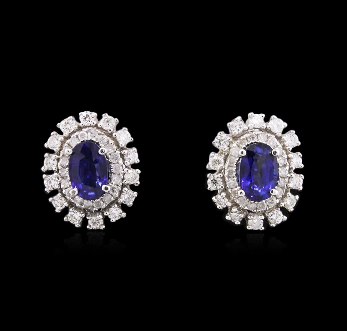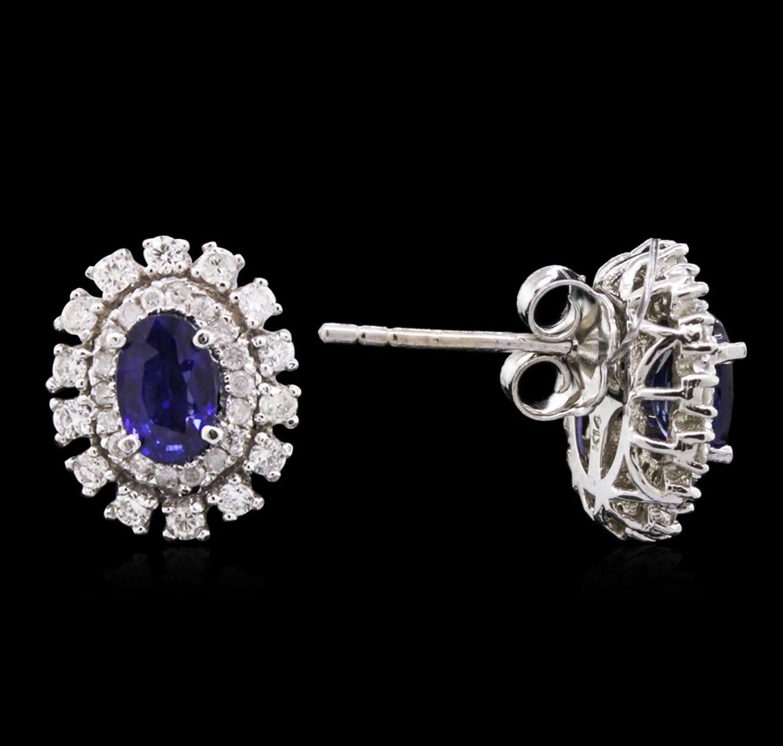 One pair electronically tested 14KT white gold ladies cast sapphire and diamond earrings with friction posts with a bright polish finish. Identified with markings of "K14". Condition is new. Containing: Two prong set oval modified brilliant cut natural blue sapphires, measuring 6.00 x 4.00 x 2.60mm, approximate total weight of 1.04ct., clarity is slightly included, type II, medium, moderately strong, blue color, (GIA B 5/4), cut is good. Sixty-Four prong set round brilliant cut diamonds, measuring 1.50 - 1.00 x 0.75mm (depth est.) approximate total weight of 64 Stones = 0.30ct. Clarity: SI-2 to I-1. Color: I - J, Cut is Good. Colored gemstones are presumed to have been subjected to commonly used enhancement processes. All diamonds and colored gemstones are graded in the mounting, unless otherwise stated. Total Weight of Colored Stones 1.04ct. Total Weight of Diamonds 0.30ct. Total Weight of Earrings 2.70 grams. GGL Appraised at $2,410.00.