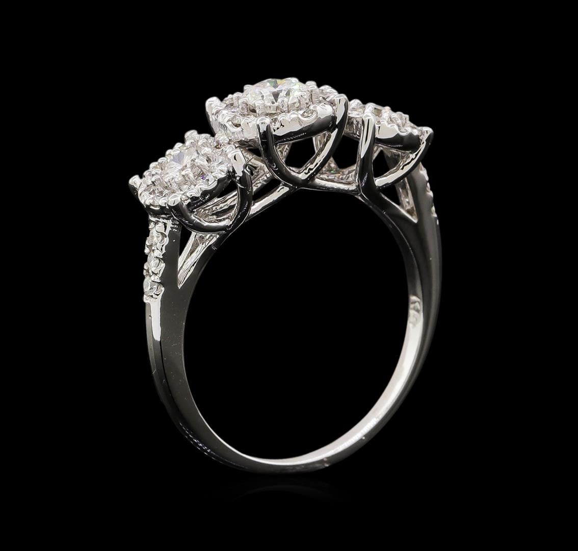One electronically tested 14KT white gold ladies cast diamond engagement ring with a bright polish finish. Identified with markings of "K14". Condition is new. Containing: One prong set round brilliant cut diamond, measuring 4.50 - 4.50 x 2.70mm (depth est.) approximate weight of 0.33ct. Clarity: I-1. Color: J, Cut is Good. Two prong set round brilliant cut diamonds, measuring 3.50 - 3.50 x 2.10mm (depth est.) approximate total weight of 2 Stones = 0.31ct. Clarity: I-1. Color: J, Cut is Good. Thirty-Six prong set round brilliant cut diamonds, measuring 1.60 - 1.30 x 0.87mm (depth est.) approximate total weight of 36 Stones = 0.40ct. Clarity: SI-2 to I-1. Color: I - J, Cut is Good. All diamonds are graded in the mounting, unless otherwise stated. Total Weight of Diamonds 1.05ct. Total Weight of Engagement Ring 4.30 grams. GGL Appraised at $3,065.00.