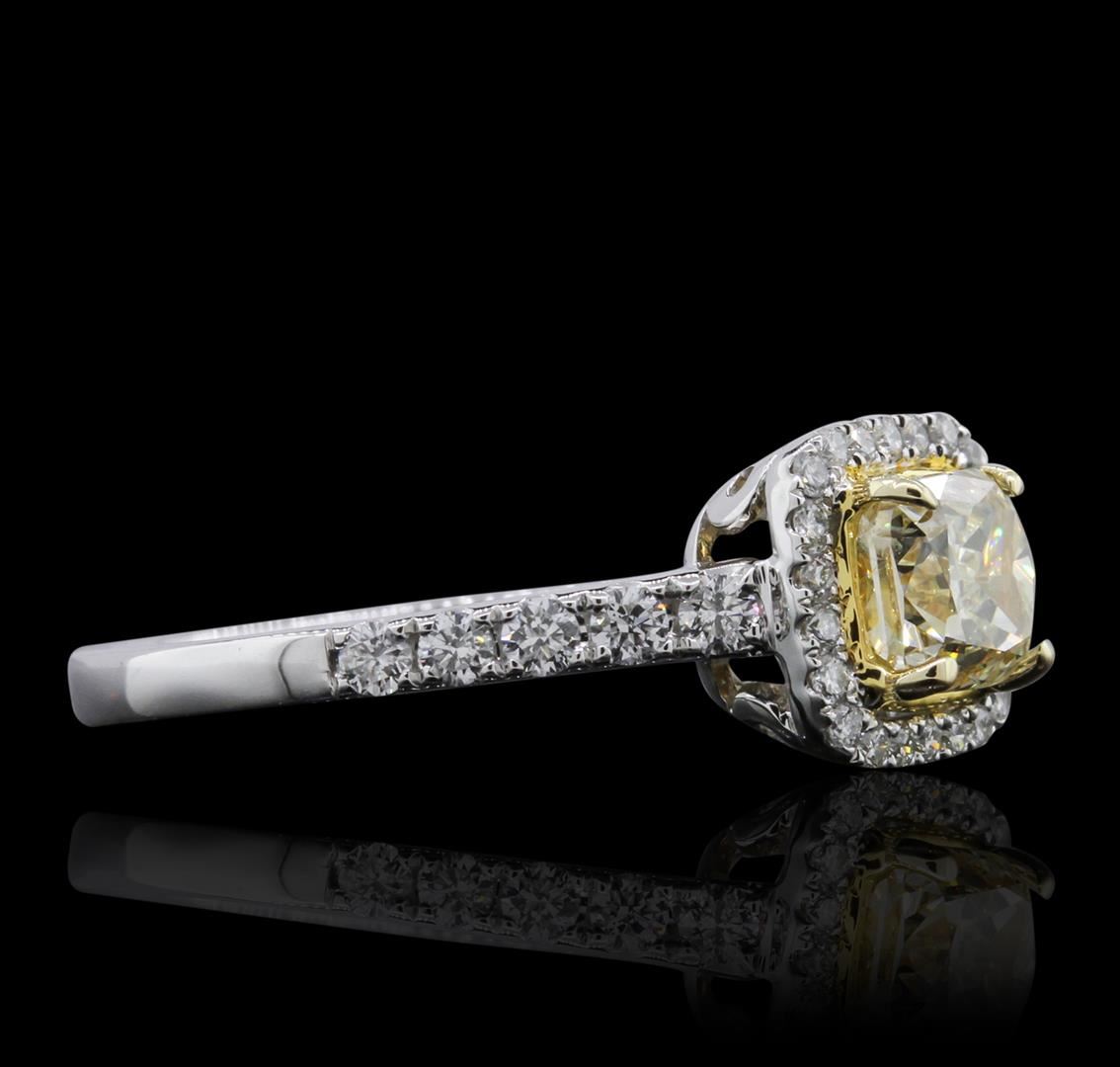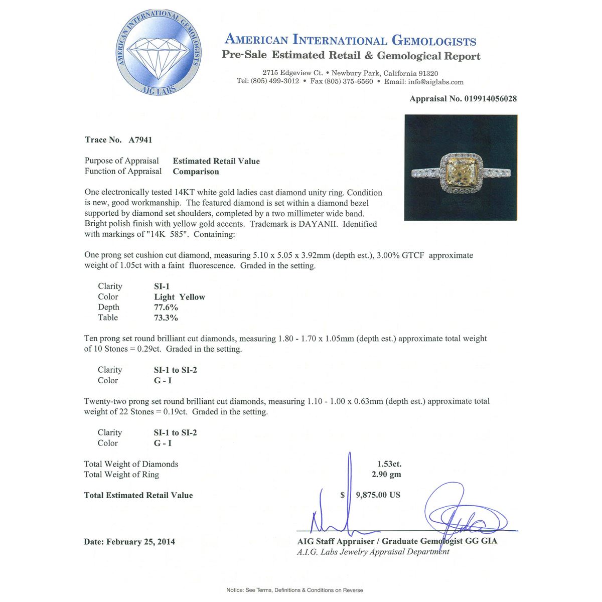 One electronically tested 14KT white gold ladies cast diamond unity ring. Condition is new, good workmanship. The featured diamond is set within a diamond bezel supported by diamond set shoulders, completed by a two millimeter wide band. Bright polish finish with yellow gold accents. Trademark is DAYANII. Identified with markings of "14K 585". Containing: One prong set cushion cut diamond, measuring 5.10 x 5.05 x 3.92mm (depth est.), 3.00% GTCF approximate weight of 1.05ct with a faint fluorescence. Graded in the setting. Clarity SI-1 Depth 77.6%Table 73.3% Ten prong set round brilliant cut diamonds, measuring 1.80 - 1.70 x 1.05mm (depth est.) approximate total weight of 10 Stones = 0.29ct. Graded in the setting. Clarity SI-1 to SI-2 Color G - I Twenty-Two prong set round brilliant cut diamonds, measuring 1.10 - 1.00 x 0.63mm (depth est.) approximate total weight of 22 Stones = 0.19ct. Graded in the setting. Clarity SI-1 to SI-2 Color G - I Total Weight of Diamonds 1.53ct. Total Weight of Ring 2.90 grams. AIG Appraised at $9,875.00.