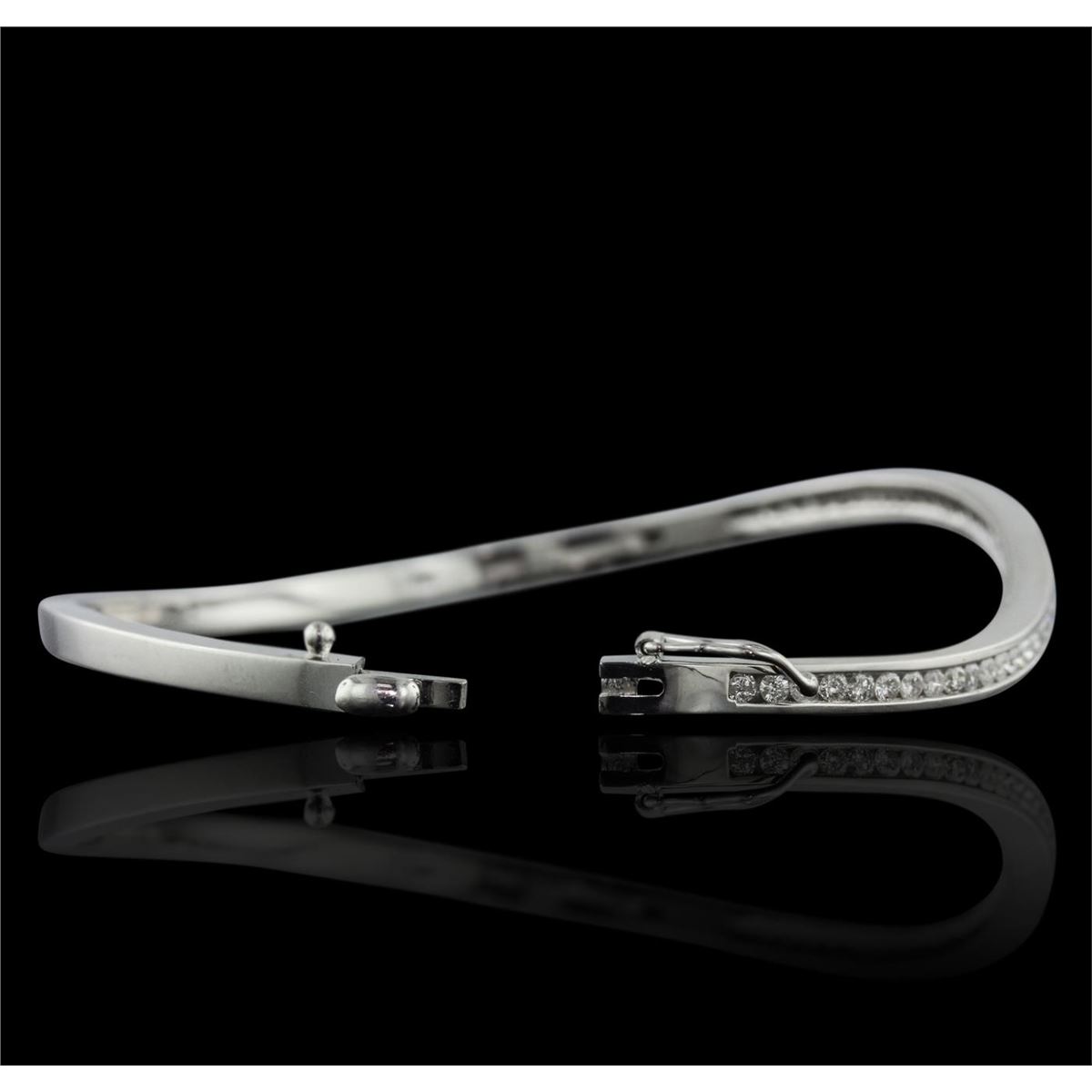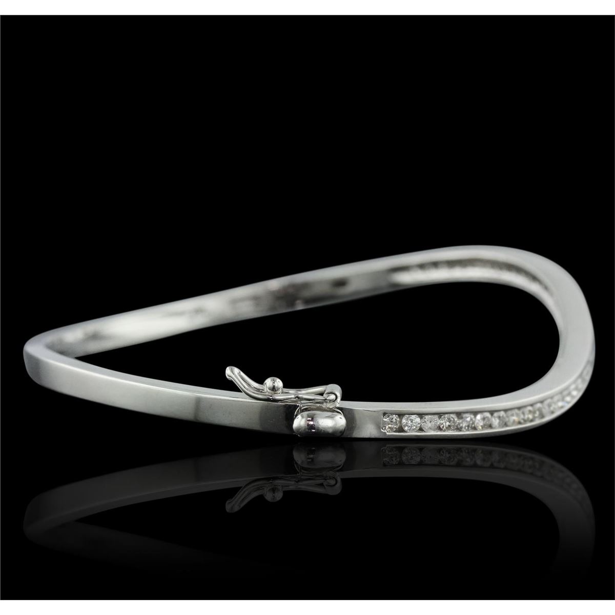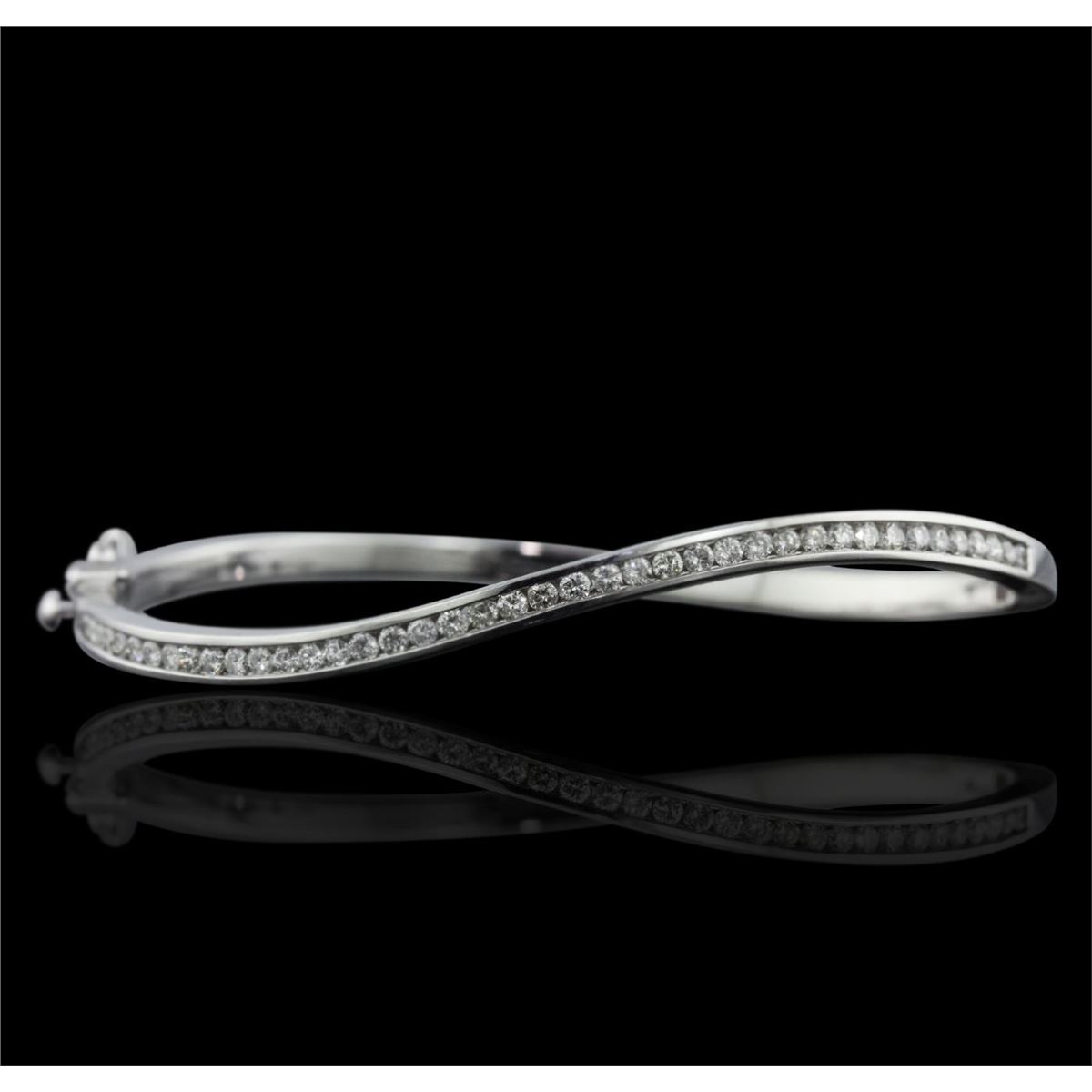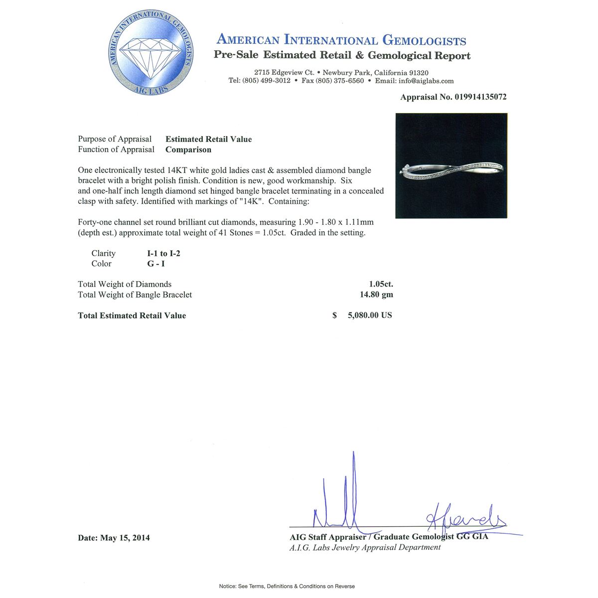 One electronically tested 14KT white gold ladies cast & assembled diamond bangle bracelet with a bright polish finish. Condition is new, good workmanship. Six and one-half inch length diamond set hinged bangle bracelet terminating in a concealed clasp with safety. Identified with markings of "14K". Containing: Forty-One channel set round brilliant cut diamonds, measuring 1.90 - 1.80 x 1.11mm (depth est.) approximate. Total Weight of 41 Stones = 1.05ct. Graded in the setting. Clarity: I-1 to I-2. Color: G - I. Total Weight of Diamonds 1.05ct. Total Weight of Bangle Bracelet 14.80 grams. AIG Appraised at $5,080.00.