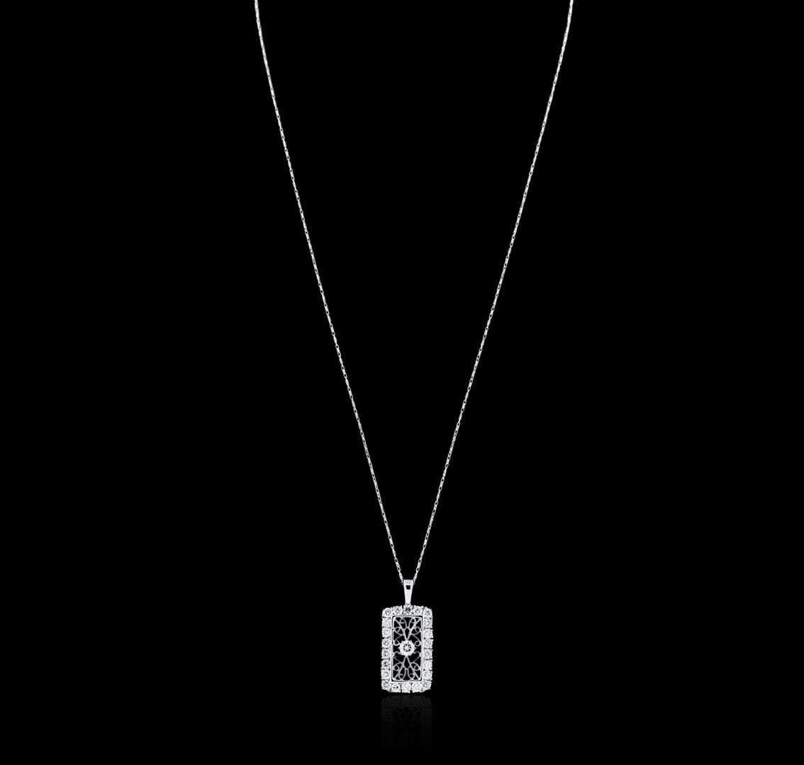 One electronically tested 14KT white gold ladies cast diamond pendant & chain 18.0" long, cable link with a lobster claw clasp with a bright polish finish. Identified with markings of "14K". Condition is new. Containing: One prong set round brilliant cut diamond, measuring 3.60 - 3.90 x 2.25mm (depth est.) approximate weight of 0.19ct. Clarity: I-1. Color: J, Cut is Good. Twenty-Two prong set round brilliant cut diamonds, measuring 2.20 - 2.20 x 1.32mm (depth est.) approximate total weight of 22 Stones = 0.86ct. Clarity: SI-1 to SI-2. Color: I - J, Cut is Good. All diamonds are graded in the mounting, unless otherwise stated. Total Weight of Diamonds 1.05ct. Total Weight of Pendant & Chain 5.90 grams. GGL Appraised at $4,930.00.