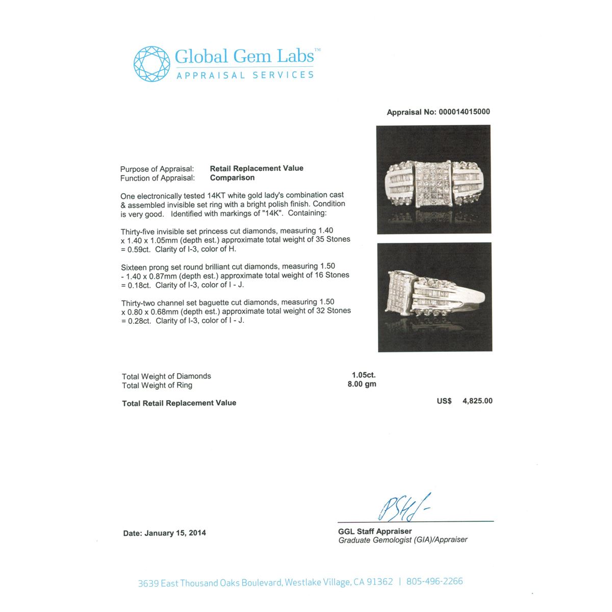 One electronically tested 14KT white gold lady's combination cast & assembled invisible set ring with a bright polish finish. Identified with markings of "14K". Condition is very good. Containing: Thirty-Five invisible set princess cut diamonds, measuring 1.40 x 1.40 x 1.05mm (depth est.) approximate total weight of 35 Stones = 0.59ct. Clarity of I-3, Color of H. Sixteen prong set round brilliant cut diamonds, measuring 1.50 - 1.40 x 0.87mm (depth est.) approximate total weight of 16 Stones = 0.18ct. Clarity of I-3, Color of I - J. Thirty-Two channel set baguette cut diamonds, measuring 1.50 x 0.80 x 0.68mm (depth est.) approximate total weight of 32 Stones = 0.28ct. Clarity of I-3, Color of I - J. Total Weight of Diamonds 1.05ct. Total Weight of Ring 8.00gm. GGL Appraised at $4,825.00.
