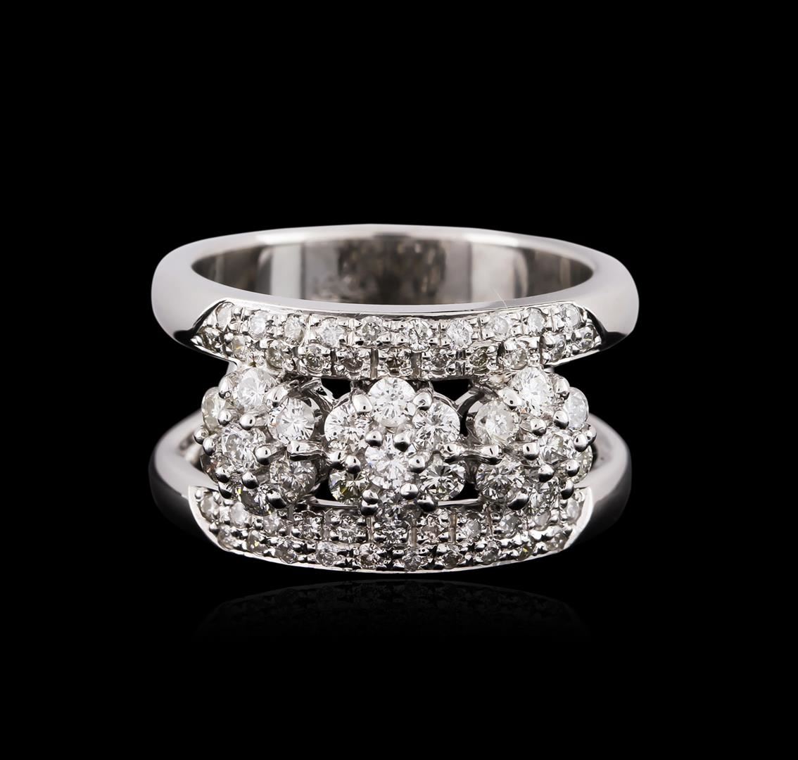 One electronically tested 14KT white gold ladies cast diamond ring with a bright polish finish. Identified with markings of "14K". Condition is very good. Containing: Twenty-One prong set round brilliant cut diamonds, measuring 2.10 - 2.10 x 1.26mm (depth est.) approximate total weight of 21 Stones = 0.71ct. Clarity: SI-1 to SI-2. Color: H - I, Cut is Good. Forty-Two prong set round brilliant cut diamonds, measuring 1.30 - 1.30 x 0.78mm (depth est.) approximate total weight of 42 Stones = 0.34ct. Clarity: SI-1 to I-1. Color: H - I. All diamonds are graded in the mounting, unless otherwise stated. Total Weight of Diamonds 1.05ct. Total Weight of Ring 9.10 grams. GGL Appraised at $5,485.00.
