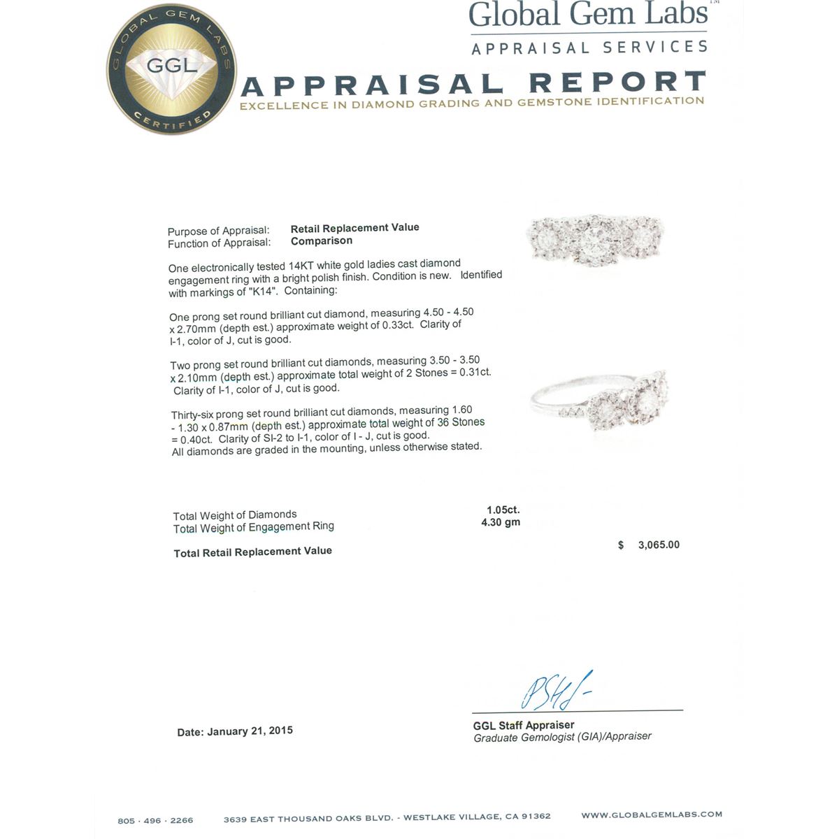 One electronically tested 14KT white gold ladies cast diamond engagement ring with a bright polish finish. Identified with markings of "K14". Condition is new. Containing: One prong set round brilliant cut diamond, measuring 4.50 - 4.50 x 2.70mm (depth est.) approximate weight of 0.33ct. Clarity: I-1. Color: J, Cut is Good. Two prong set round brilliant cut diamonds, measuring 3.50 - 3.50 x 2.10mm (depth est.) approximate total weight of 2 Stones = 0.31ct. Clarity: I-1. Color: J, Cut is Good. Thirty-Six prong set round brilliant cut diamonds, measuring 1.60 - 1.30 x 0.87mm (depth est.) approximate total weight of 36 Stones = 0.40ct. Clarity: SI-2 to I-1. Color: I - J, Cut is Good. All diamonds are graded in the mounting, unless otherwise stated. Total Weight of Diamonds 1.05ct. Total Weight of Engagement Ring 4.30 grams. GGL Appraised at $3,065.00.