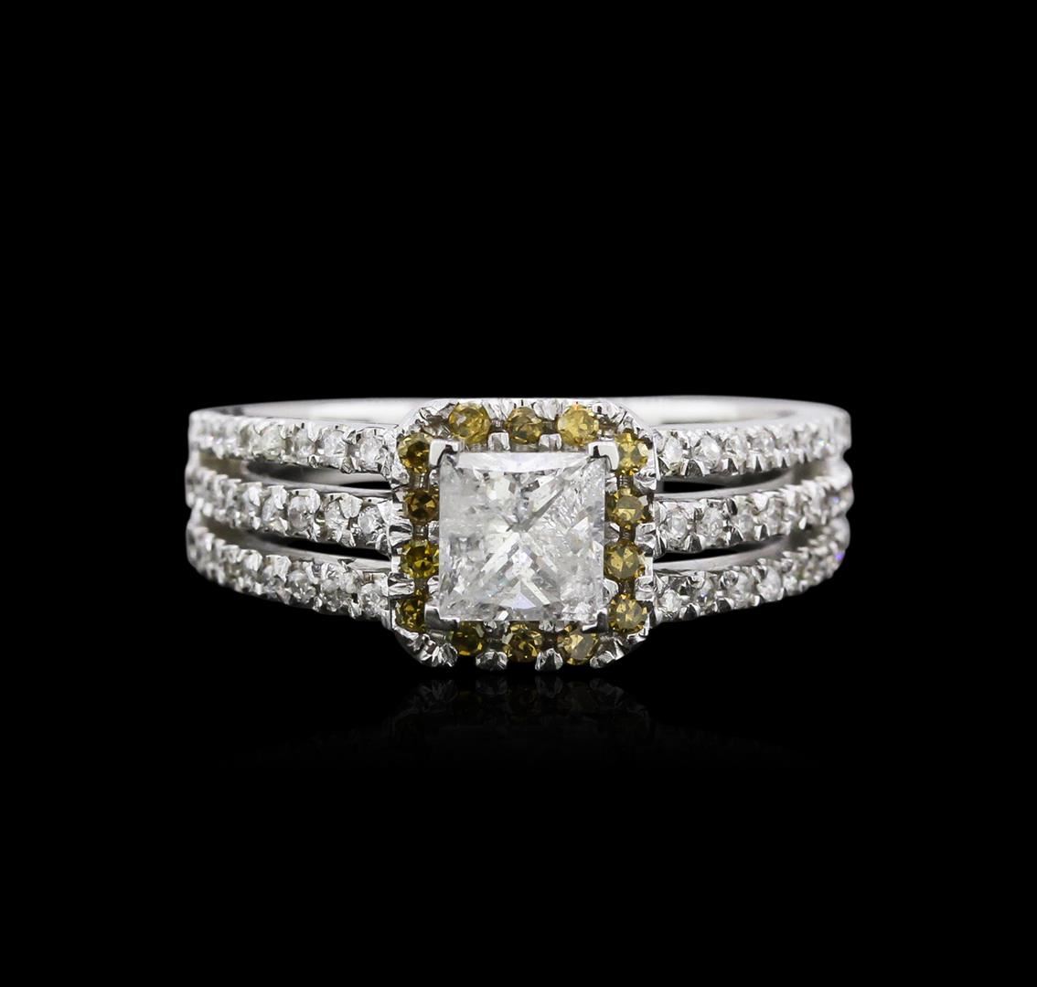 One electronically tested 14KT white gold ladies cast diamond ring with a bright polish finish. Identified with markings of "14K". Condition is new. Containing: One prong set princess cut diamond, measuring 4.90 x 4.80 x 3.60mm (depth est.) approximate weight of 0.70ct. Clarity: I-2. Color: H, Cut is Good. Thirty-Six prong set round brilliant cut diamonds, measuring 1.10 - 1.10 x 0.66mm (depth est.) approximate total weight of 36 Stones = 0.25ct. Clarity: I-1 to I-2. Color: H - I, Cut is Good. Fourteen single cut diamonds, measuring 1.10 - 1.10 x 0.66mm (depth est.) approximate total weight of 14 Stones = 0.10ct. Color of the stones has been treated. Diamonds are graded in the mounting, unless otherwise stated. Total Weight of Diamonds 1.05ct. Total Weight of Ring 5.50 grams. GGL Appraised at $3,625.00.