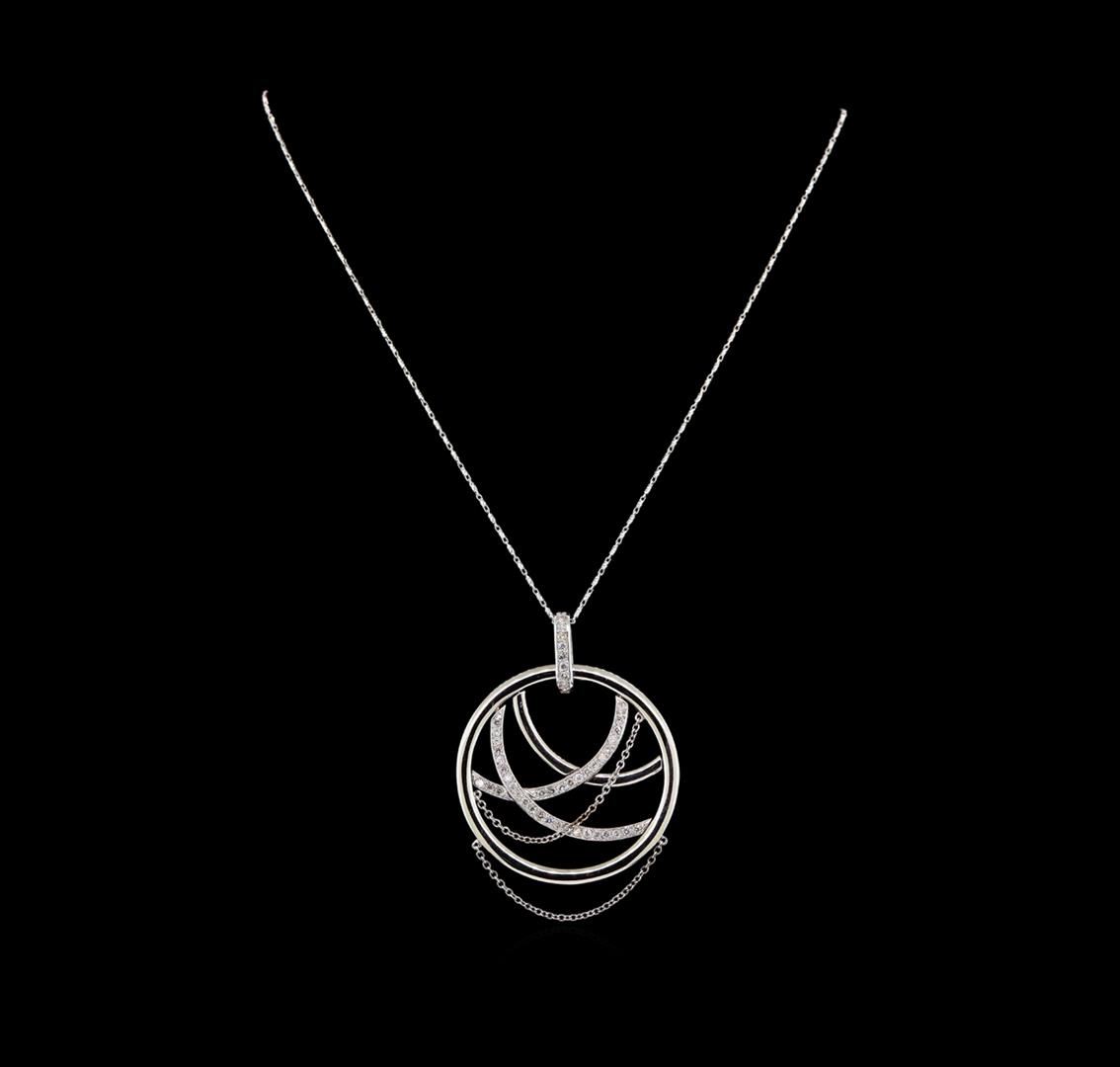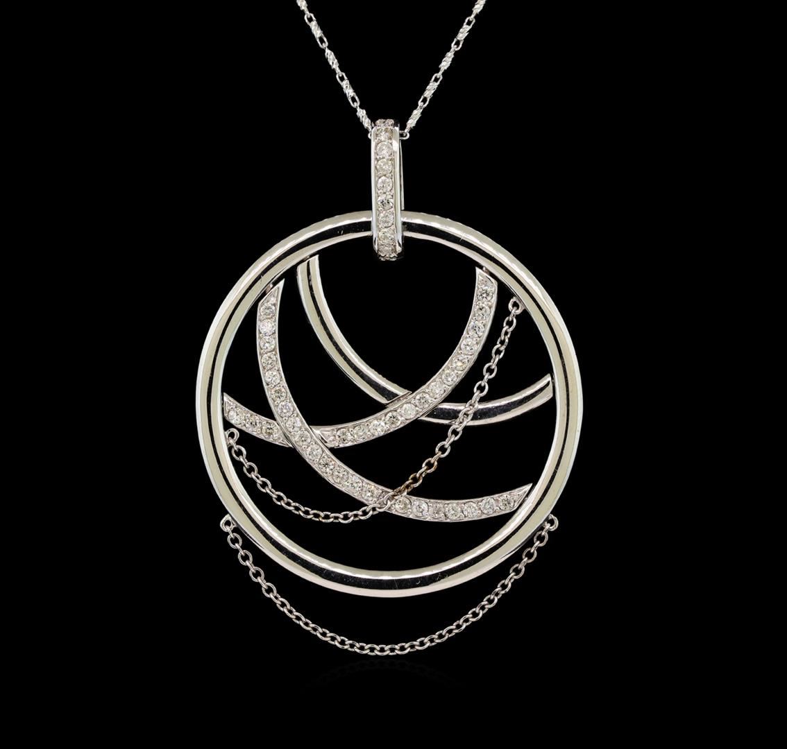 One electronically tested 14KT white gold ladies cast & assembled diamond pendant with chain. The pendant features an outer white gold circle with inner intertwining diamond ribbons and two white gold draping chains, completed by a diamond set bail. The pendant is supported by an eighteen inch length 14KT white gold designer style chain, terminating in a lobster claw clasp. Bright polish finish. Identified with markings of "585". Condition is new, good workmanship. Containing: Forty-Nine prong set round brilliant cut diamonds, measuring 1.80 - 1.70 x 1.05mm (depth est.) approximate total weight of 49 Stones = 1.06ct. Graded in the setting. Clarity: SI-1 to I-1. Color: G - I. Total Weight of Diamonds 1.06ct. Total Weight of Pendant With Chain 15.97 grams. AIG Appraised at $5,495.00.