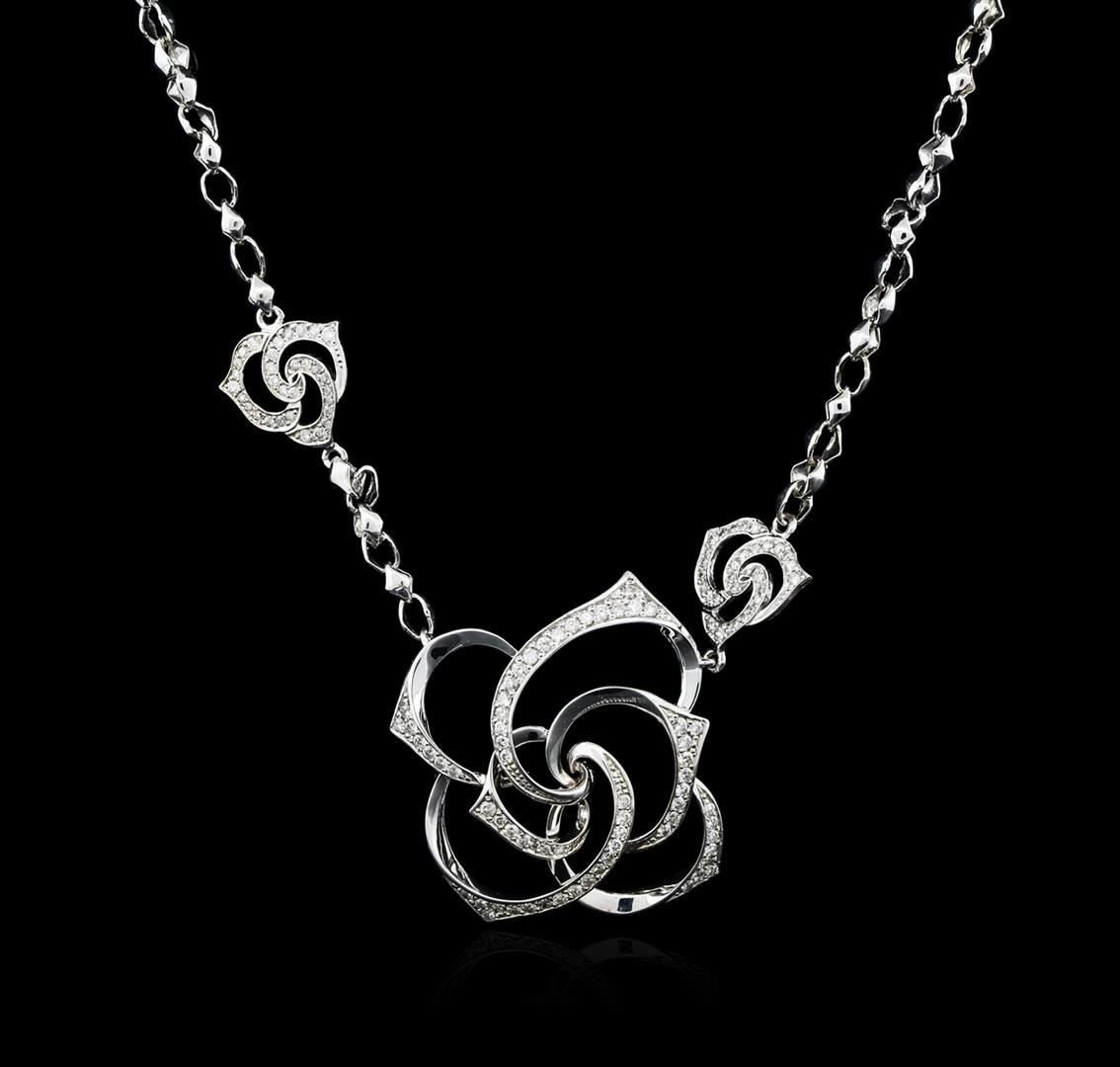 One electronically tested 14KT white gold ladies cast diamond necklace with a spring ring clasp with a bright polish finish. Measurements: 18" in length Identified with markings of "585". Condition is new. Containing: One Hundred Thirty-Three bead set round brilliant cut diamonds, measuring 1.30 - 1.30 x 0.78mm (depth est.) approximate total weight of 133 Stones = 1.06ct. Clarity: SI-1 to I-1. Color: I - J, Cut is Good. All diamonds are graded in the mounting, unless otherwise stated. Total Weight of Diamonds 1.06ct. Total Weight of Necklace 17.50 grams. GGL Appraised at $5,745.00.