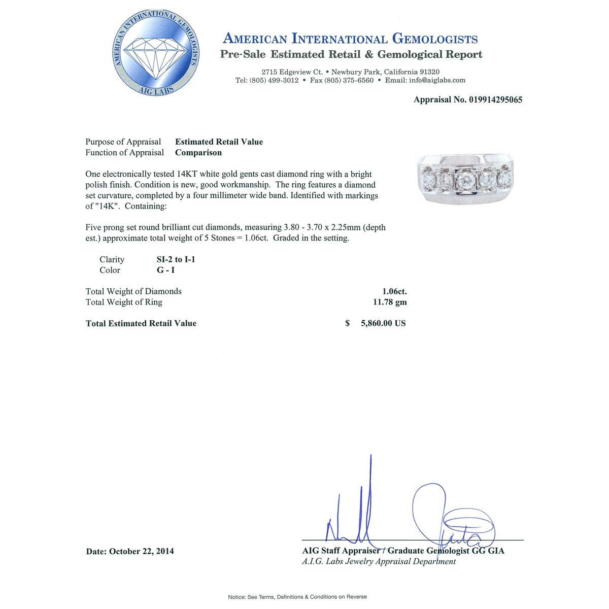 One electronically tested 14KT white gold gents cast diamond ring with a bright polish finish. The ring features a diamond set curvature, completed by a four millimeter wide band. Identified with markings of 14K. Condition is new, good workmanship. Containing: Five prong set round brilliant cut diamonds, measuring 3.80 - 3.70 x 2.25mm (depth est.) approximate total weight of 5 Stones = 1.06ct. Graded in the setting. Clarity: SI-2 to I-1. Color: G - I. Total Weight of Diamonds 1.06ct. Total Weight of Ring 11.78 grams. AIG Appraised at $5,860.00.