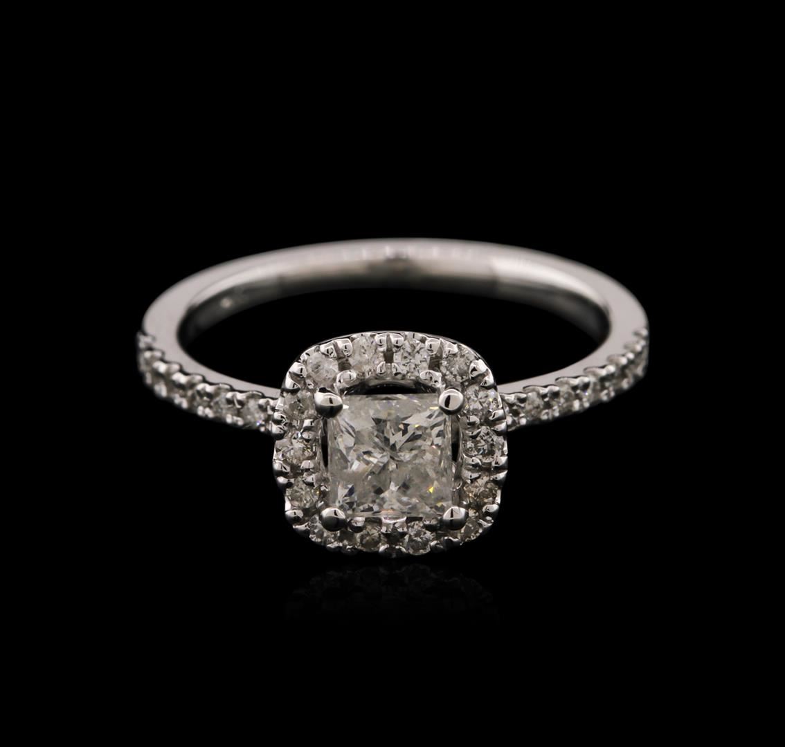 One electronically tested 14KT white gold ladies cast diamond ring with a bright polish finish. Identified with markings of "14K". Condition is new. Containing: One prong set princess cut diamond, measuring 4.60 x 4.60 x 3.45mm (depth est.) approximate weight of 0.83ct. Clarity: I-2. Color: H, Cut is Good. Thirty-Six prong set round brilliant cut diamonds, measuring 1.10 - 1.10 x 0.66mm (depth est.) approximate total weight of 36 Stones = 0.23ct. Clarity: I-1. Color: I - J, Cut is Good. Diamonds are graded in the mounting, unless otherwise stated. Total Weight of Diamonds 1.06ct. Total Weight of Ring 2.60 grams. GGL Appraised at $3,615.00.