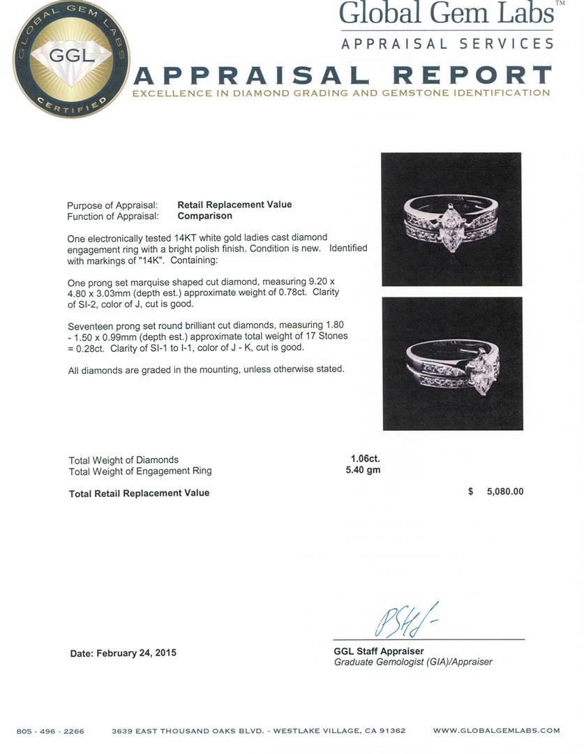 One electronically tested 14KT white gold ladies cast diamond engagement ring with a bright polish finish. Identified with markings of "14K". Condition is new. Containing: One prong set marquise shaped cut diamond, measuring 9.20 x 4.80 x 3.03mm (depth est.) approximate weight of 0.78ct. Clarity: SI-2. Color: J, Cut is Good. Seventeen prong set round brilliant cut diamonds, measuring 1.80 - 1.50 x 0.99mm (depth est.) approximate total weight of 17 Stones = 0.28ct. Clarity: SI-1 to I-1. Color: J - K, Cut is Good. All diamonds are graded in the mounting, unless otherwise stated. Total Weight of Diamonds 1.06ct. Total Weight of Engagement Ring 5.40 grams. GGL Appraised at $5,080.00.