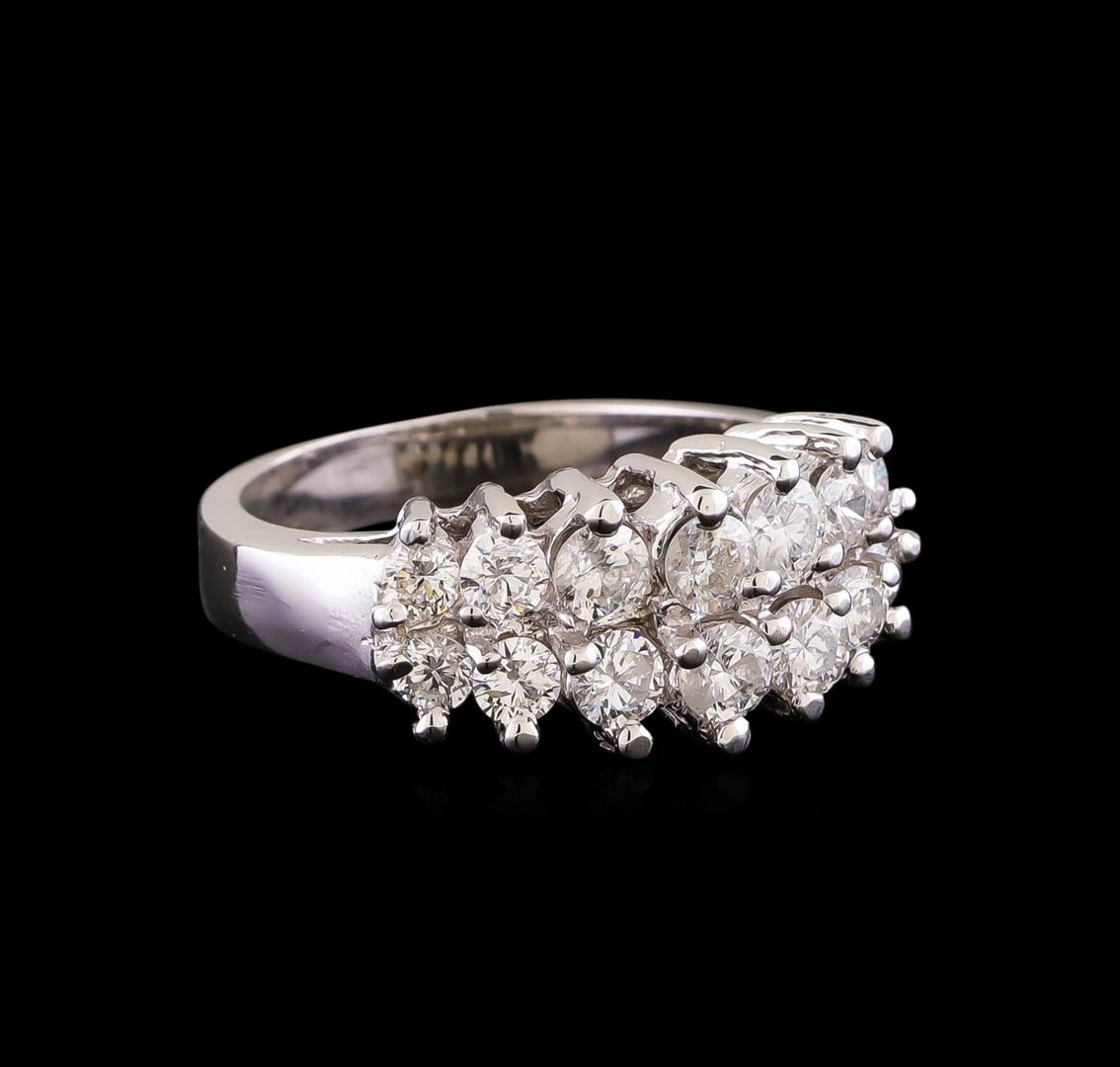 One electronically tested 14KT white gold ladies cast diamond ring with a bright polish finish. Identified with markings of "14K". Condition is new. Containing: Fourteen prong set round brilliant cut diamonds, measuring 3.00 - 2.50 x 1.65mm (depth est.) approximate total weight of 14 Stones = 1.07ct. Clarity: SI-2 to I-1. Color: I - J, Cut is Good. All diamonds are graded in the mounting, unless otherwise stated. Total Weight of Diamonds 1.07ct. Total Weight of Ring 5.60 grams. GGL Appraised.