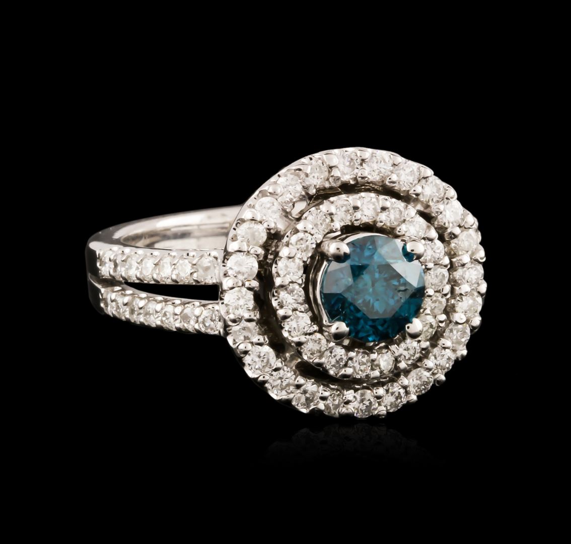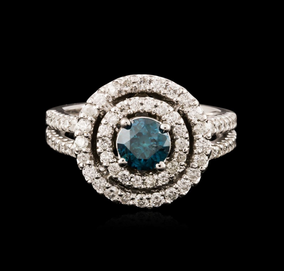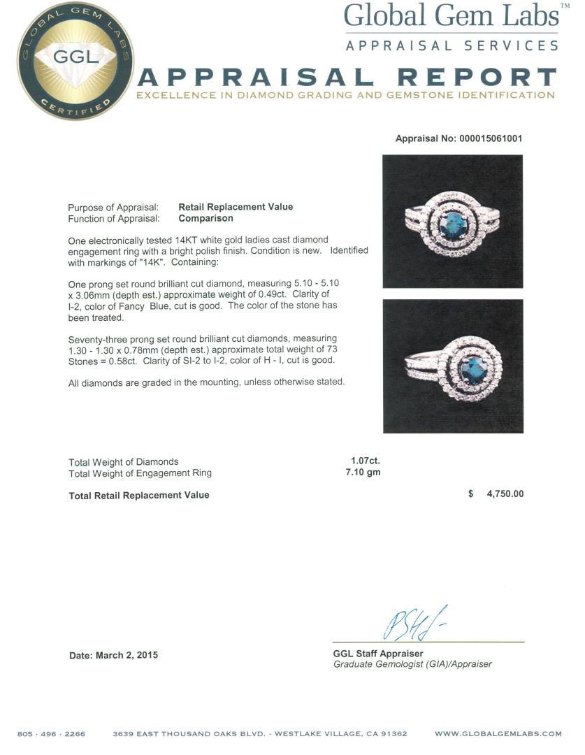 One electronically tested 14KT white gold ladies cast diamond engagement ring with a bright polish finish. Identified with markings of "14K". Condition is new. Containing: One prong set round brilliant cut diamond, measuring 5.10 - 5.10 x 3.06mm (depth est.) approximate weight of 0.49ct. Clarity: I-2, Cut is Good. The color of the stone has been treated. Seventy-Three prong set round brilliant cut diamonds, measuring 1.30 - 1.30 x 0.78mm (depth est.) approximate total weight of 73 Stones = 0.58ct. Clarity: SI-2 to I-2. Color: H - I, Cut is Good. All diamonds are graded in the mounting, unless otherwise stated. Total Weight of Diamonds 1.07ct. Total Weight of Engagement Ring 7.10 grams. GGL Appraised at $4,750.00.