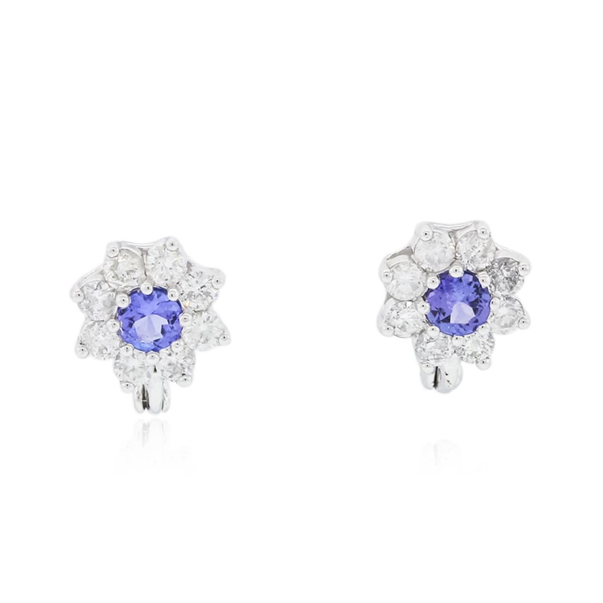 One pair electronically tested 14KT white gold ladies combination cast & assembled tanzanite and diamond earrings with hinged clip backs with a bright polish finish. Identified with markings of "14K". Condition is new. Containing: Two prong set round modified brilliant cut natural tanzanites, measuring 5.00 - 5.00 x 3.25 mm, approximate total weight of 1.08ct., clarity is eye clean, type I, medium light, very slightly grayish, violet color, (GIA V 4/3), cut is good. Sixteen prong set round brilliant cut diamonds, measuring 3.00 - 3.00 x 1.80mm (depth est.) approximate total weight of 16 Stones = 1.58ct. Clarity: SI-2 to I-2. Color: I - J, Cut is Good. Colored gemstones are presumed to have been subjected to commonly used enhancement processes. All diamonds and colored gemstones are graded in the mounting, unless otherwise stated. Total Weight of Colored Stones 1.08ct. Total Weight of Diamonds 1.58ct. Total Weight of Earrings 6.10 grams. GGL Appraised at $5,415.00.
