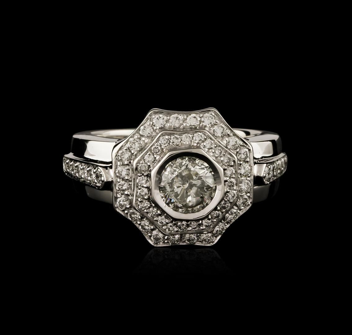 One electronically tested 14KT white gold ladies cast diamond engagement ring with a bright polish finish. Identified with markings of "14K". Condition is new. Containing: One bezel set round brilliant cut diamond, measuring 5.80 - 5.80 x 3.48mm (depth est.) approximate weight of 0.71ct. Clarity: I-2. Color: K. Sixty prong set round brilliant cut diamonds, measuring 1.20 - 1.20 x 0.72mm (depth est.) approximate total weight of 60 Stones = 0.38ct. Clarity: SI-2 to I-1. Color: J - K, Cut is Good. All diamonds are graded in the mounting, unless otherwise stated. Total Weight of Diamonds 1.09ct. Total Weight of Engagement Ring 13.90 grams. GGL Appraised at $5,020.00.