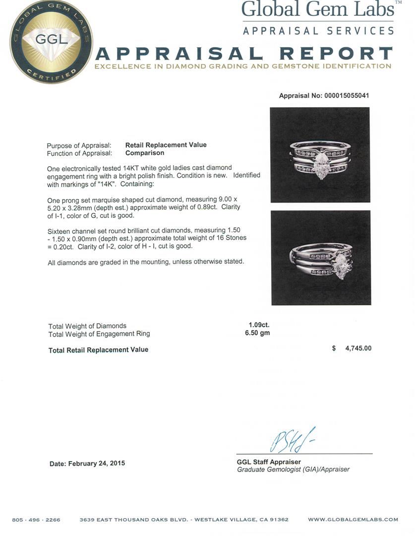 One electronically tested 14KT white gold ladies cast diamond engagement ring with a bright polish finish. Identified with markings of "14K". Condition is new. Containing: One prong set marquise shaped cut diamond, measuring 9.00 x 5.20 x 3.28mm (depth est.) approximate weight of 0.89ct. Clarity: I-1. Color: G, Cut is Good. Sixteen channel set round brilliant cut diamonds, measuring 1.50 - 1.50 x 0.90mm (depth est.) approximate total weight of 16 Stones = 0.20ct. Clarity: I-2. Color: H - I, Cut is Good. All diamonds are graded in the mounting, unless otherwise stated. Total Weight of Diamonds 1.09ct. Total Weight of Engagement Ring 6.50 grams. GGL Appraised at $4,745.00.