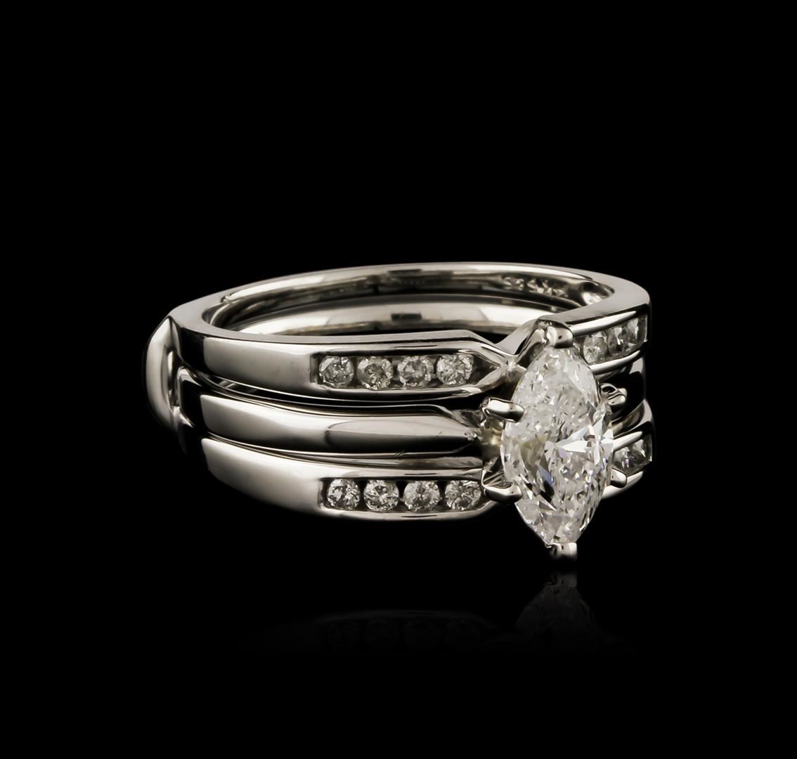 One electronically tested 14KT white gold ladies cast diamond engagement ring with a bright polish finish. Identified with markings of "14K". Condition is new. Containing: One prong set marquise shaped cut diamond, measuring 9.00 x 5.20 x 3.28mm (depth est.) approximate weight of 0.89ct. Clarity: I-1. Color: G, Cut is Good. Sixteen channel set round brilliant cut diamonds, measuring 1.50 - 1.50 x 0.90mm (depth est.) approximate total weight of 16 Stones = 0.20ct. Clarity: I-2. Color: H - I, Cut is Good. All diamonds are graded in the mounting, unless otherwise stated. Total Weight of Diamonds 1.09ct. Total Weight of Engagement Ring 6.50 grams. GGL Appraised at $4,745.00.