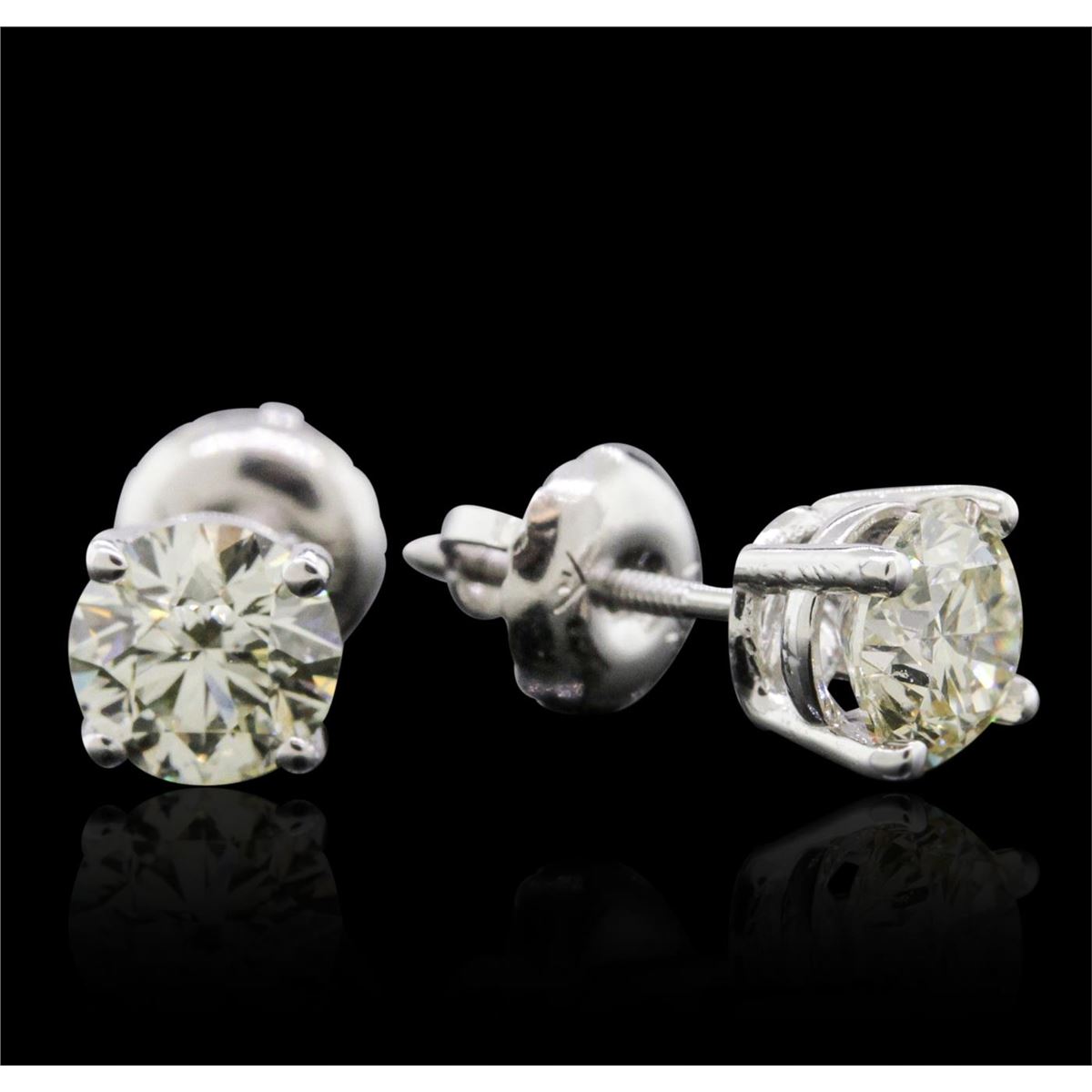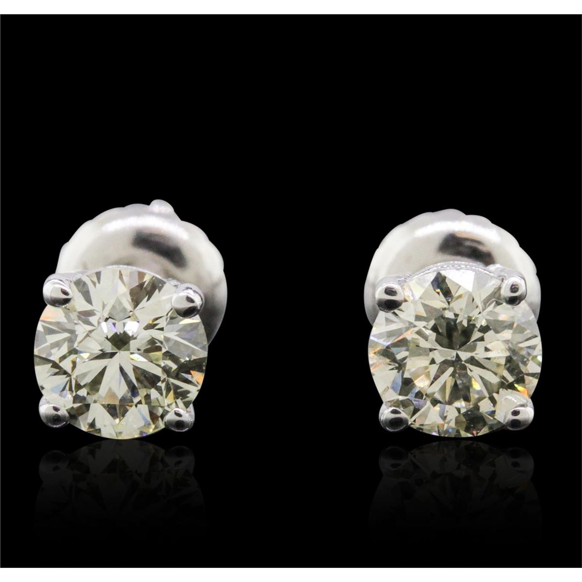 One pair electronically tested 14KT white gold cast & assembled diamond solitaire earrings with screw backs. Condition is new, good workmanship. Containing: One prong set round brilliant cut diamond, measuring 5.18 - 5.15 x 3.25mm (depth est.), 4.00% GTCF approximate weight of 0.55ct with a very strong blue fluorescence. Graded in the setting. Clarity: I-1. Depth: 62.9%. Table 58.0%. One prong set round brilliant cut diamond, measuring 5.20 - 5.17 x 3.28mm (depth est.) approximate weight of 0.54ct with a strong blue fluorescence. Graded in the setting. Clarity: I-1. Depth: 63.2%. Table 51.6%. Total Weight of Diamonds 1.09ct. Total Weight of Earrings 1.00 grams. AIG Appraised at $3,280.00.