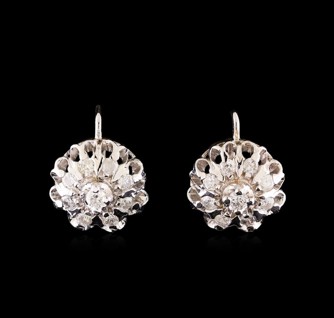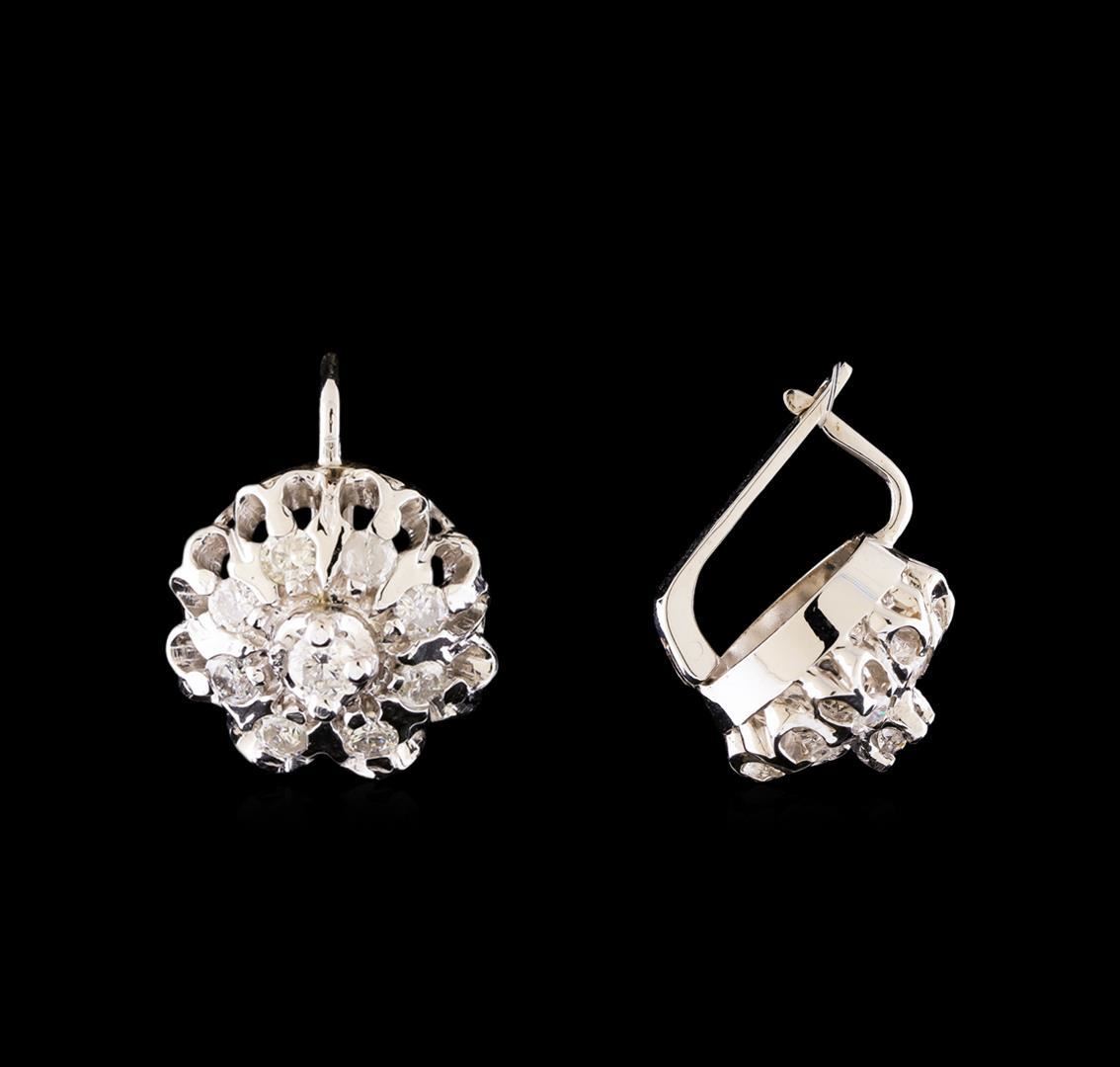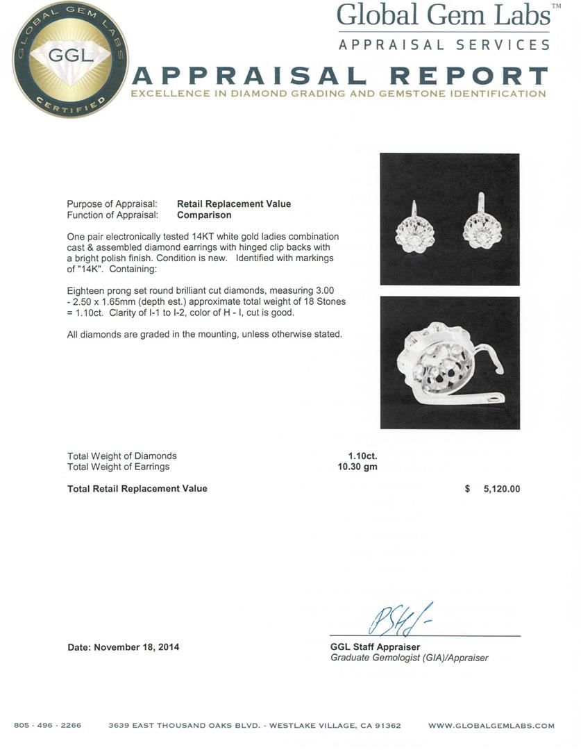 One pair electronically tested 14KT white gold ladies combination cast & assembled diamond earrings with hinged clip backs with a bright polish finish. Identified with markings of "14K". Condition is new. Containing: Eighteen prong set round brilliant cut diamonds, measuring 3.00 - 2.50 x 1.65mm (depth est.) approximate total weight of 18 Stones = 1.10 ct. Clarity: I-1 to I-2. Color: H - I, Cut is Good. All diamonds are graded in the mounting, unless otherwise stated. Total Weight of Diamonds 1.10 ct. Total Weight of Earrings 10.30 grams. GGL Appraised.