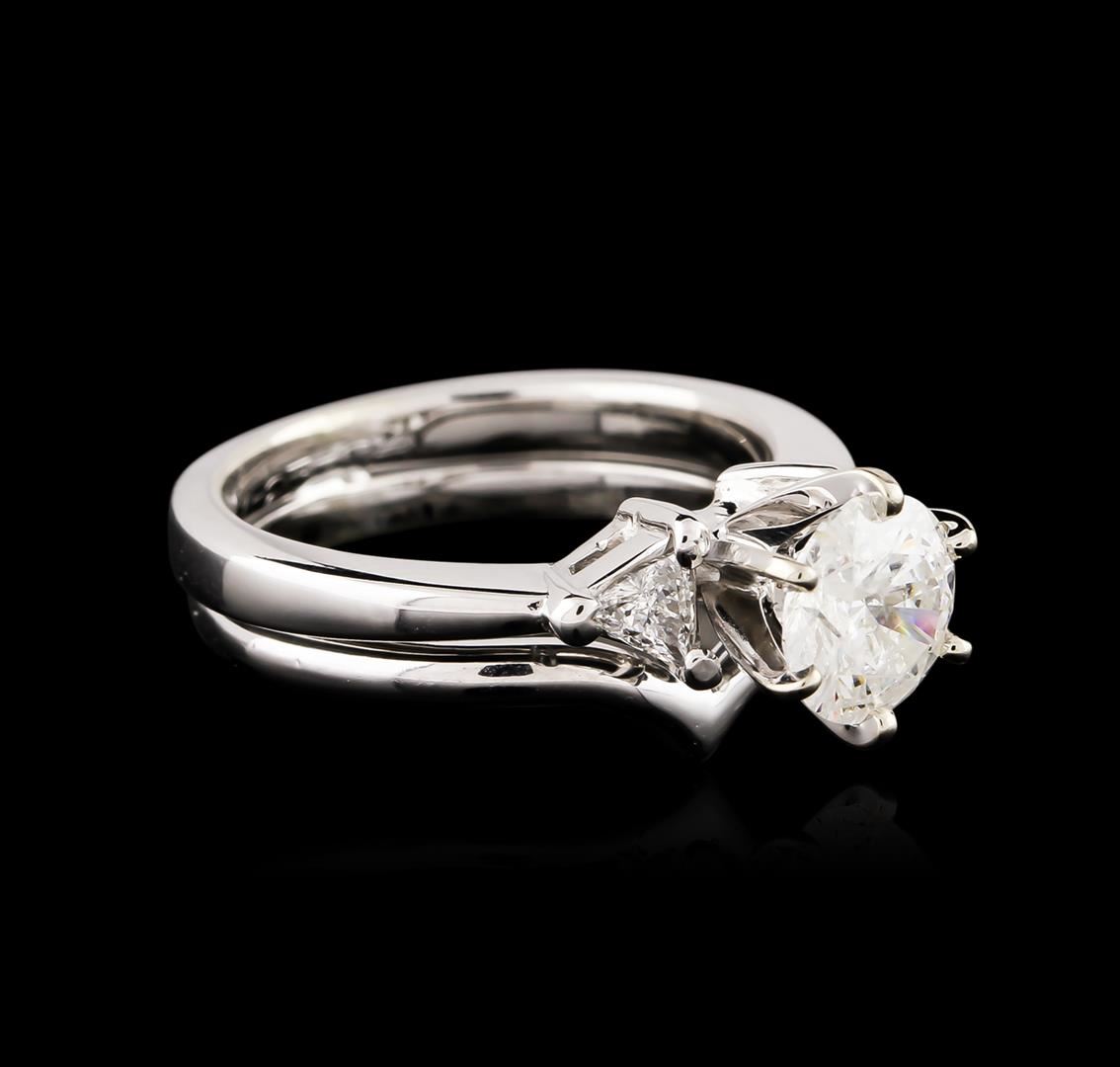 One electronically tested 14KT white gold ladies cast diamond engagement ring with a bright polish finish. Identified with markings of "585". Condition is new. Containing: One prong set round brilliant cut diamond, measuring 6.50 - 6.42 x 3.88mm (depth est.) approximate weight of 0.99ct. Clarity: I-2. Color: J, Cut is Good. Two prong set triangle brilliant cut diamonds, measuring 2.50 x 2.50 x 1.55mm (depth est.) approximate total weight of 2 Stones = 0.11ct. Clarity: SI-1 to SI-2. Color: H - I, Cut is Good. All diamonds are graded in the mounting, unless otherwise stated. Total Weight of Diamonds 1.10ct. Total Weight of Engagement Ring 5.40 grams. GGL Appraised at $6,155.00.