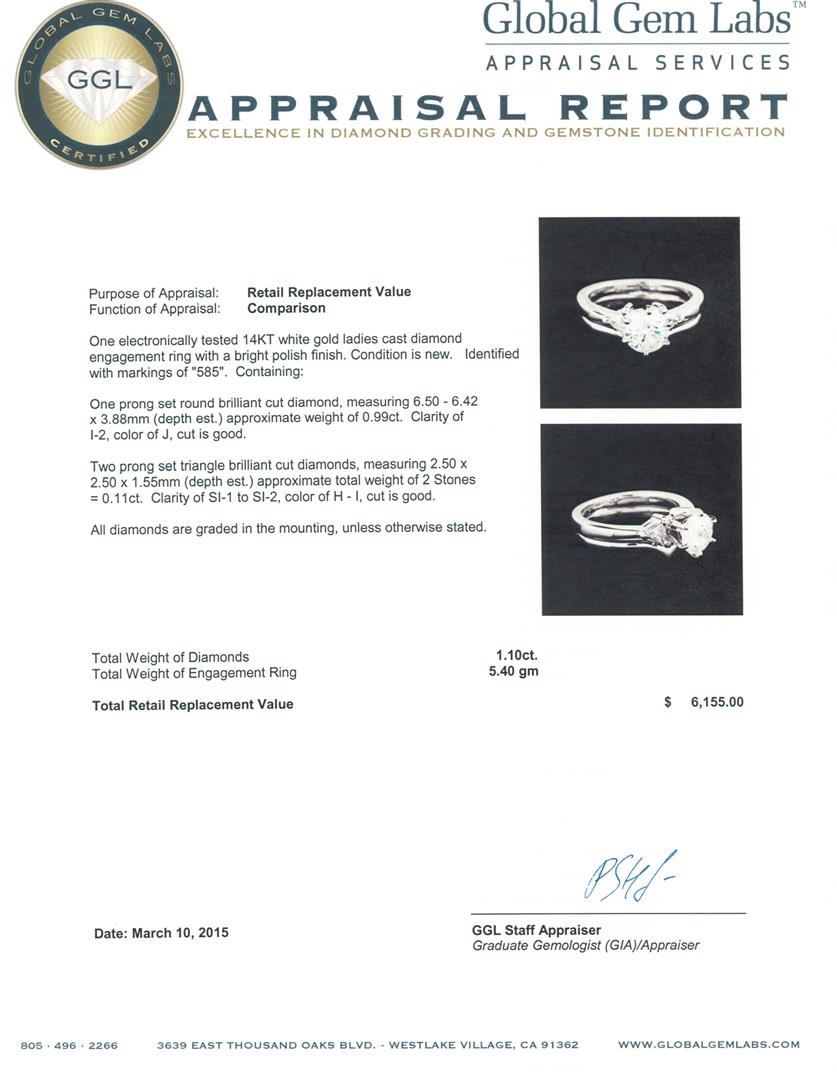 One electronically tested 14KT white gold ladies cast diamond engagement ring with a bright polish finish. Identified with markings of "585". Condition is new. Containing: One prong set round brilliant cut diamond, measuring 6.50 - 6.42 x 3.88mm (depth est.) approximate weight of 0.99ct. Clarity: I-2. Color: J, Cut is Good. Two prong set triangle brilliant cut diamonds, measuring 2.50 x 2.50 x 1.55mm (depth est.) approximate total weight of 2 Stones = 0.11ct. Clarity: SI-1 to SI-2. Color: H - I, Cut is Good. All diamonds are graded in the mounting, unless otherwise stated. Total Weight of Diamonds 1.10ct. Total Weight of Engagement Ring 5.40 grams. GGL Appraised at $6,155.00.