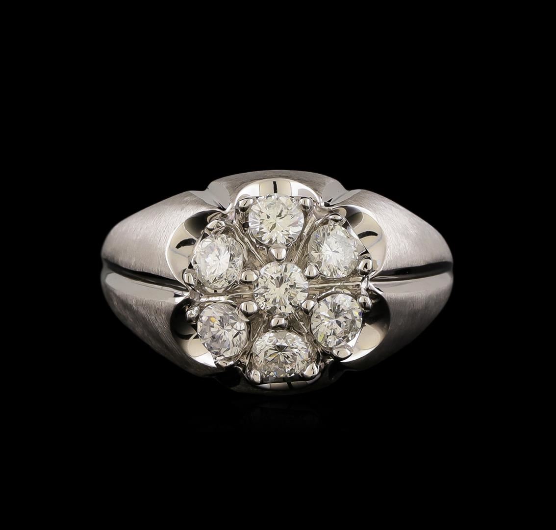 One electronically tested 14KT white gold mens combination cast & assembled diamond ring with a brushed finish. Identified with markings of "14K". Condition is new. Containing: Seven prong set round brilliant cut diamonds, measuring 3.50 - 3.50 x 2.10mm (depth est.) approximate total weight of 7 Stones = 1.10ct. Clarity: SI-2 to I-1. Color: H - I, Cut is Good. All diamonds are graded in the mounting, unless otherwise stated. Total Weight of Diamonds 1.10ct. Total Weight of Ring 10.80 grams. GGL Appraised at $5,130.00.