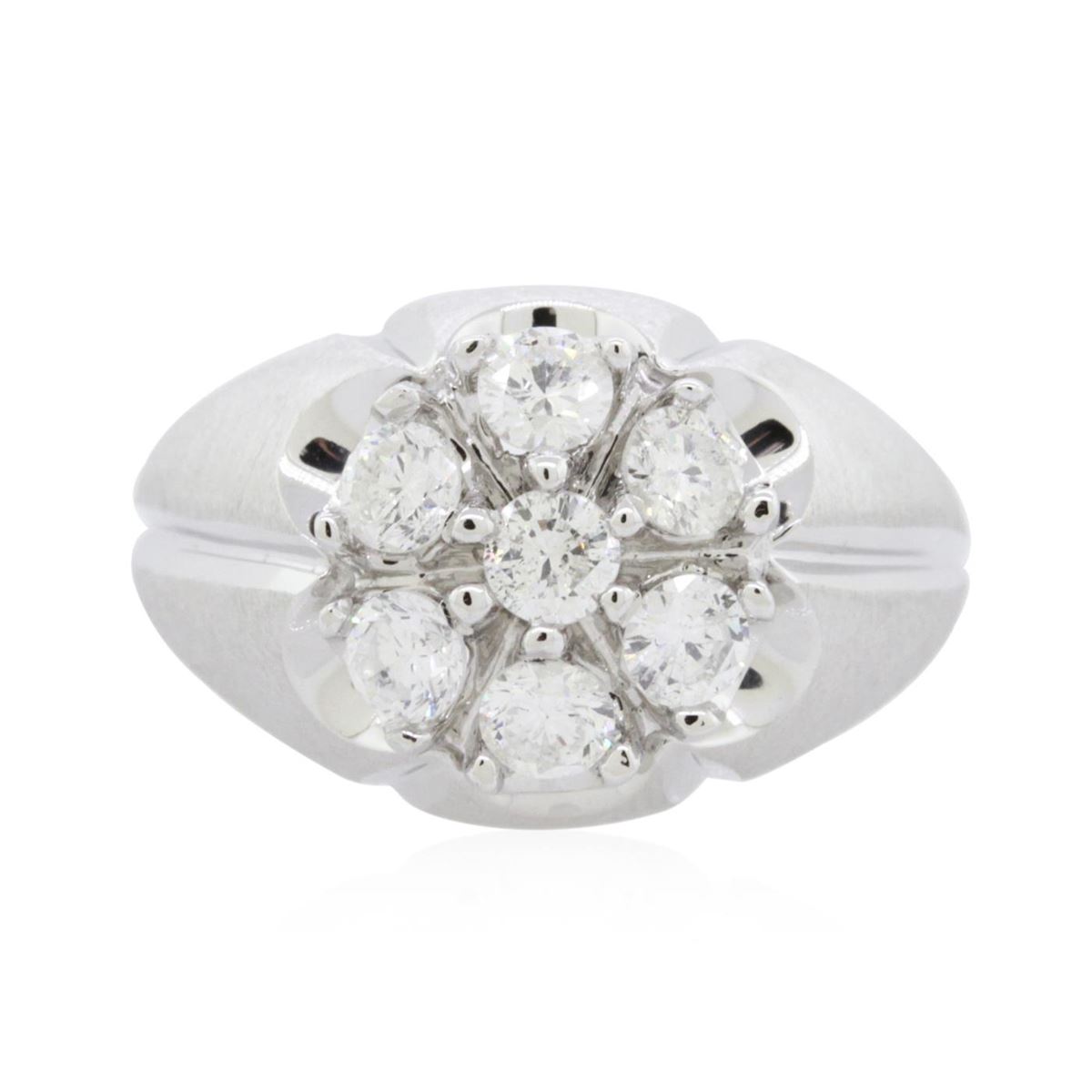 One electronically tested 14KT white gold mens combination cast & assembled diamond ring with a brushed finish. Identified with markings of "14K". Condition is new. Containing: Seven prong set round brilliant cut diamonds, measuring 3.50 - 3.50 x 2.10mm (depth est.) approximate total weight of 7 Stones = 1.10ct. Clarity: SI-2 to I-1. Color: H - I, Cut is Good. All diamonds are graded in the mounting, unless otherwise stated. Total Weight of Diamonds 1.10ct. Total Weight of Ring 10.80 grams. GGL Appraised at $5,130.00.
