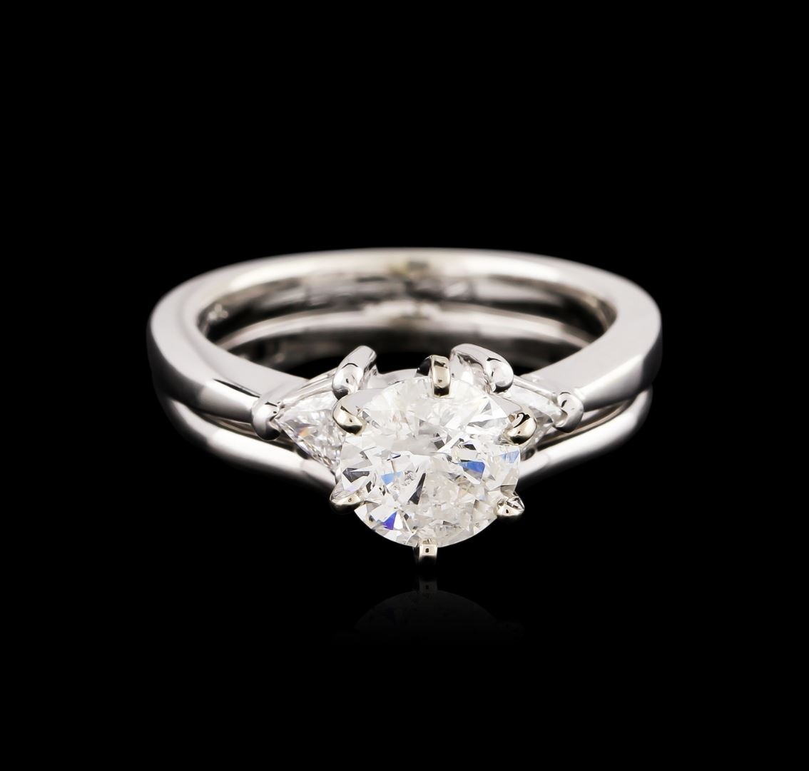 One electronically tested 14KT white gold ladies cast diamond engagement ring with a bright polish finish. Identified with markings of "585". Condition is new. Containing: One prong set round brilliant cut diamond, measuring 6.50 - 6.42 x 3.88mm (depth est.) approximate weight of 0.99ct. Clarity: I-2. Color: J, Cut is Good. Two prong set triangle brilliant cut diamonds, measuring 2.50 x 2.50 x 1.55mm (depth est.) approximate total weight of 2 Stones = 0.11ct. Clarity: SI-1 to SI-2. Color: H - I, Cut is Good. All diamonds are graded in the mounting, unless otherwise stated. Total Weight of Diamonds 1.10ct. Total Weight of Engagement Ring 5.40 grams. GGL Appraised at $6,155.00.