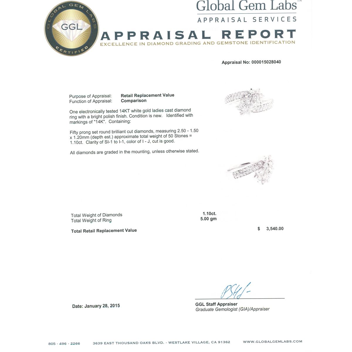One electronically tested 14KT white gold ladies cast diamond ring with a bright polish finish. Identified with markings of "14K". Condition is new. Containing: Fifty prong set round brilliant cut diamonds, measuring 2.50 - 1.50 x 1.20mm (depth est.) approximate total weight of 50 Stones = 1.10ct. Clarity: SI-1 to I-1. Color: I - J, Cut is Good. All diamonds are graded in the mounting, unless otherwise stated. Total Weight of Diamonds 1.10ct. Total Weight of Ring 5.00 grams. GGL Appraised at $3,540.00.