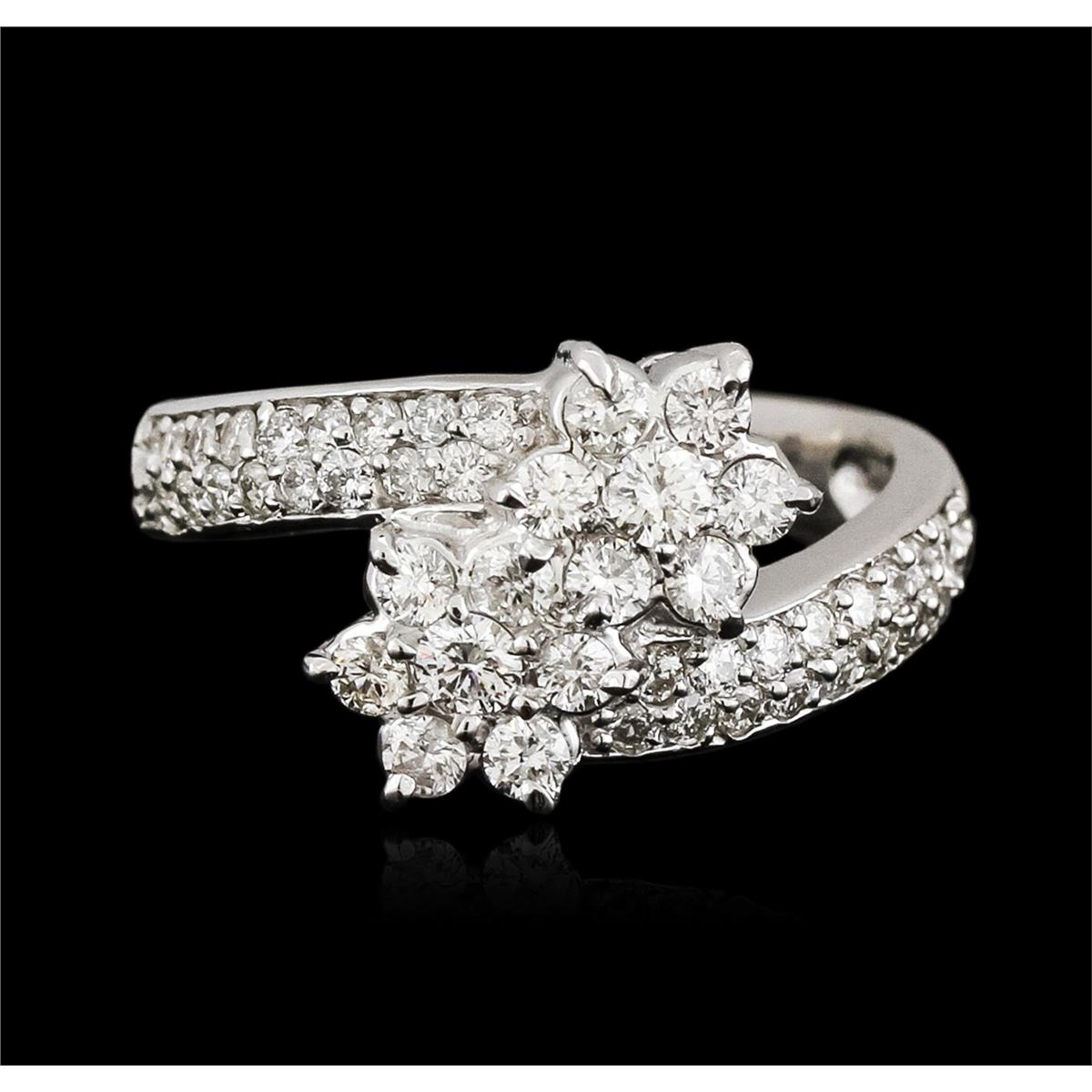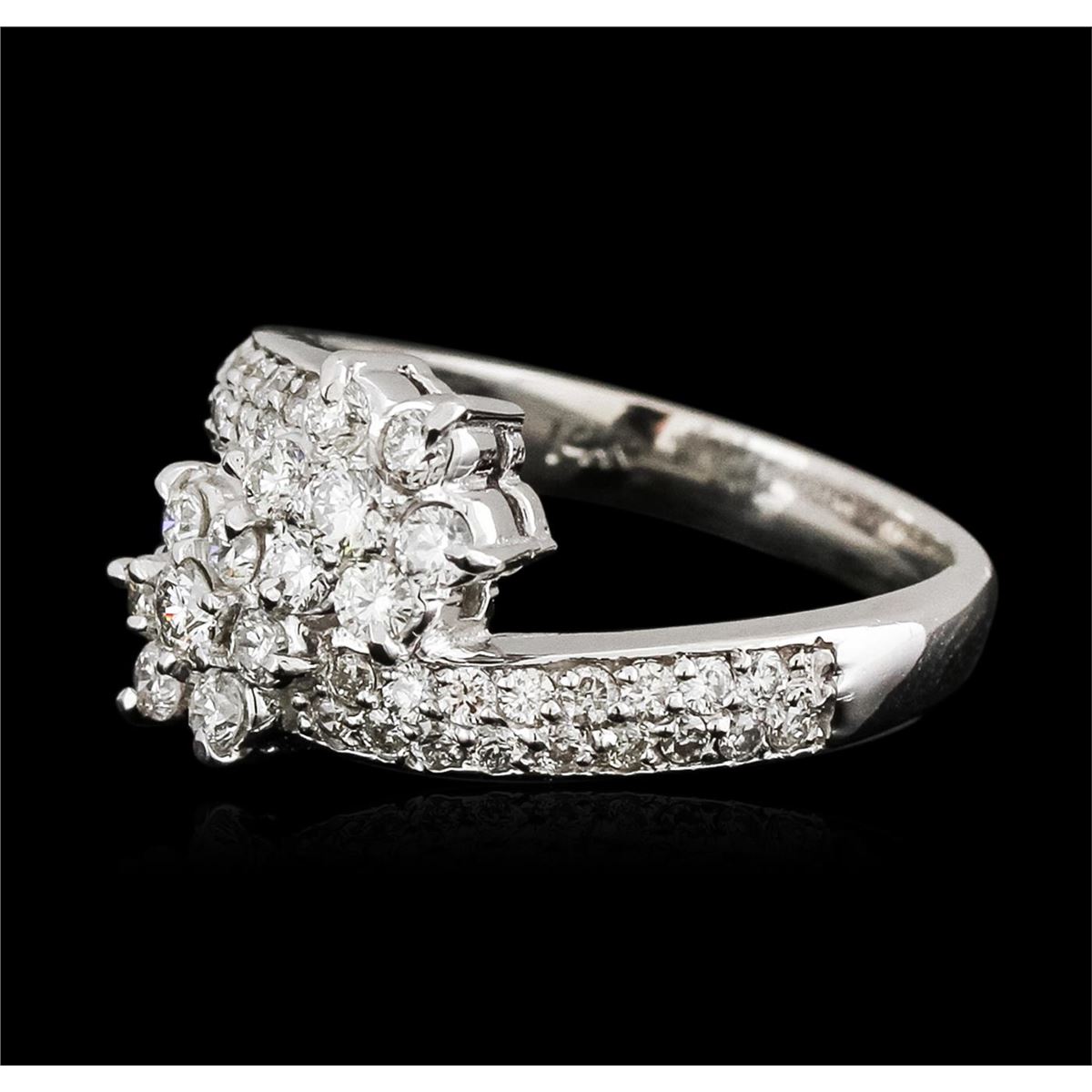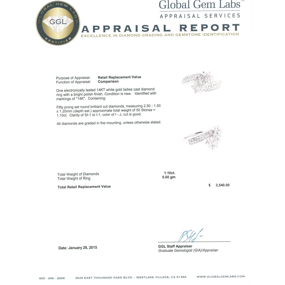 One electronically tested 14KT white gold ladies cast diamond ring with a bright polish finish. Identified with markings of "14K". Condition is new. Containing: Fifty prong set round brilliant cut diamonds, measuring 2.50 - 1.50 x 1.20mm (depth est.) approximate total weight of 50 Stones = 1.10ct. Clarity: SI-1 to I-1. Color: I - J, Cut is Good. All diamonds are graded in the mounting, unless otherwise stated. Total Weight of Diamonds 1.10ct. Total Weight of Ring 5.00 grams. GGL Appraised at $3,540.00.