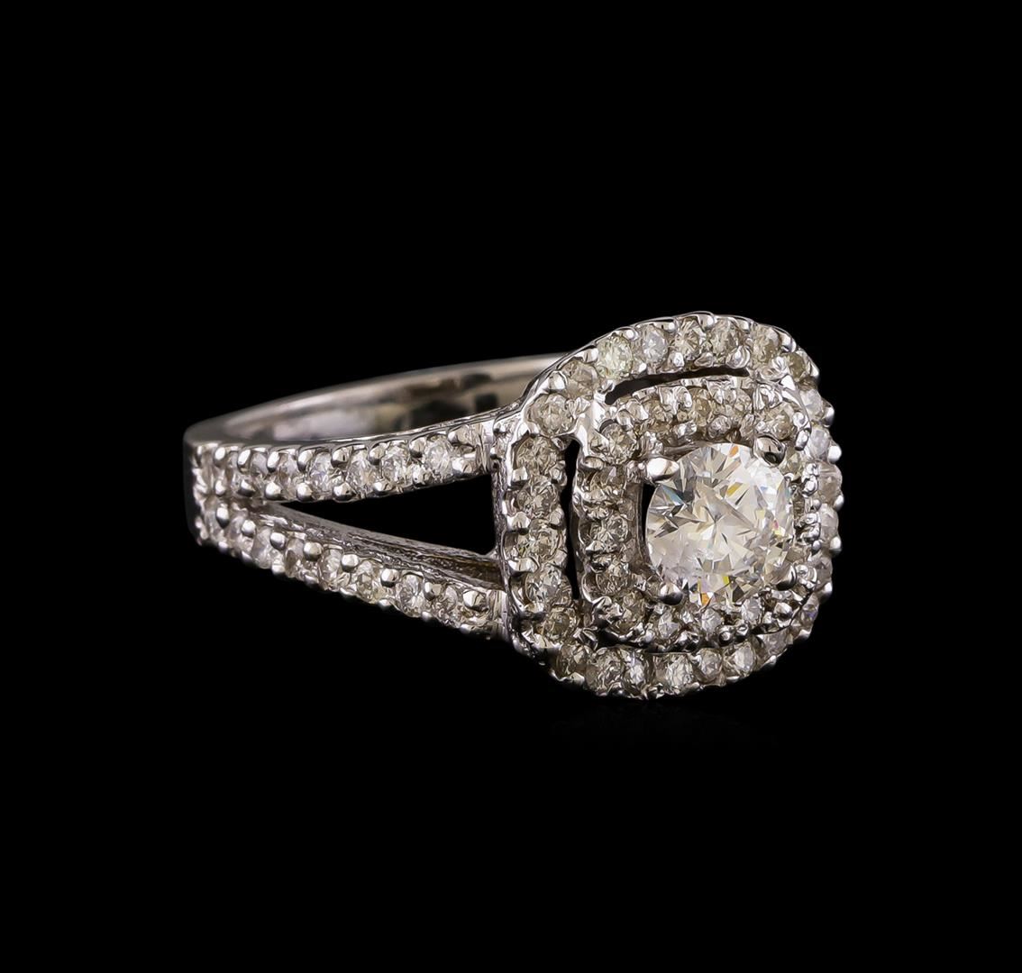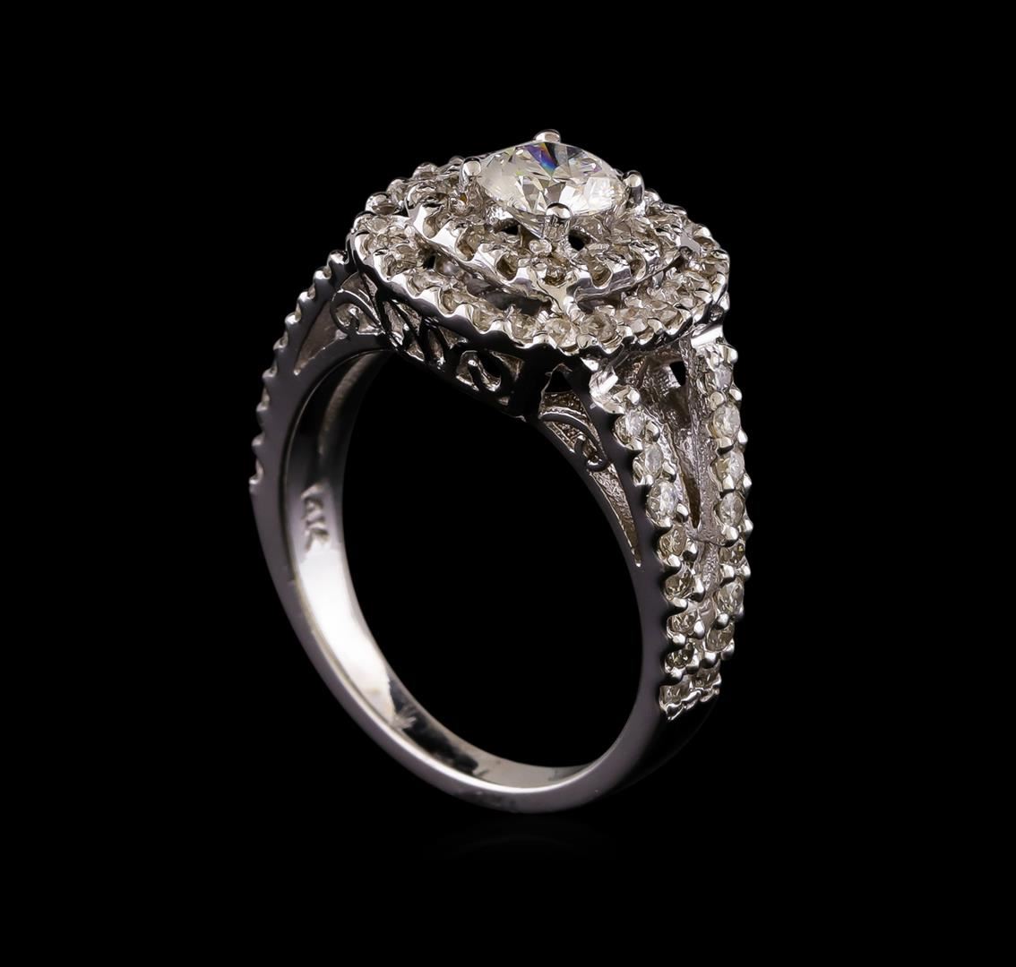 One electronically tested 14KT white gold ladies combination cast & assembled diamond engagement ring with a bright polish finish. Identified with markings of "14K". Condition is new. Containing: One prong set round brilliant cut diamond, measuring 5.30 - 5.20 x 3.15mm (depth est.) approximate weight of 0.53ct. Clarity: I-2. Color: J, Cut is Good. Seventy-Two prong set round brilliant cut diamonds, measuring 1.30 - 1.30 x 0.78mm (depth est.) approximate total weight of 72 Stones = 0.58ct. Clarity: SI-2 to I-2. Color: I - J, Cut is Good. All diamonds are graded in the mounting, unless otherwise stated. Total Weight of Diamonds 1.11ct. Total Weight of Ring 5.10 grams. GGL Appraised at $5,290.00.