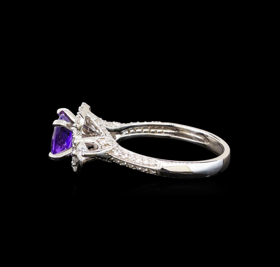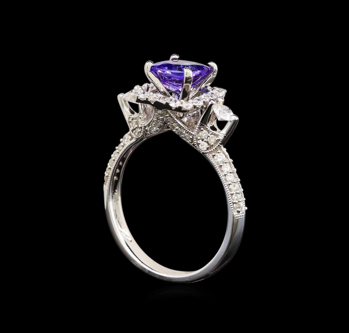 One electronically tested 14KT white gold ladies cast tanzanite and diamond ring with a flat shank with a bright polish finish. Trademark is Orianne. Identified with markings of "14K". Condition is new. Containing: One prong set square cushion modified brilliant cut natural tanzanite, measuring 6.00 x 6.00 x 3.90mm, approximate weight of 1.11ct., clarity is eye clean, type I, medium, very slightly grayish, violet color, (GIA V 5/3), cut is good. Sixty-Four prong set round brilliant cut diamonds, measuring 1.00 - 1.00 x 0.60mm (depth est.) approximate total weight of 64 Stones = 0.23ct. Clarity: SI-2 to I-1. Color: I - J, Cut is Good. Two prong set round brilliant cut diamonds, measuring 2.80 - 2.80 x 1.68mm (depth est.) approximate total weight of 2 Stones = 0.16ct. Clarity: SI-2 to I-1. Color: H - I. Colored gemstones are presumed to have been subjected to commonly used enhancement processes. All diamonds and colored gemstones are graded in the mounting, unless otherwise stated. Total Weight of Colored Stones 1.11ct. Total Weight of Diamonds 0.39ct. Total Weight of Ring 3.90 grams. GGL Appraised at $3,030.00.
