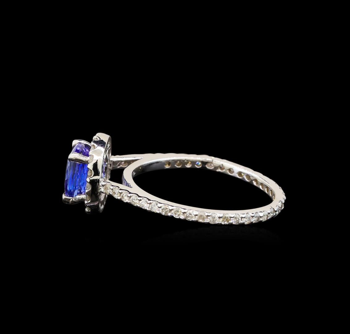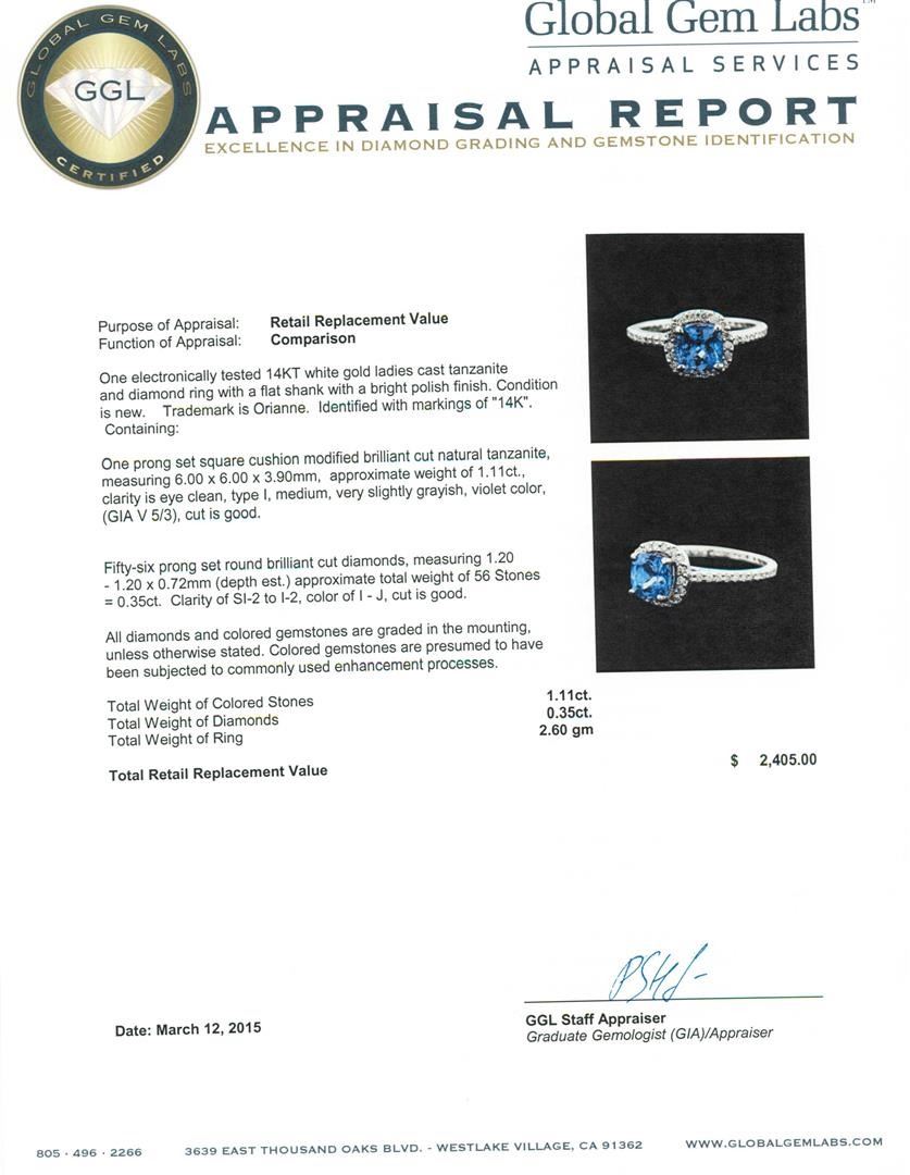 One electronically tested 14KT white gold ladies cast tanzanite and diamond ring with a flat shank with a bright polish finish. Trademark is Orianne. Identified with markings of "14K". Condition is new. Containing: One prong set square cushion modified brilliant cut natural tanzanite, measuring 6.00 x 6.00 x 3.90mm, approximate weight of 1.11ct., clarity is eye clean, type I, medium, very slightly grayish, violet color, (GIA V 5/3), cut is good. Fifty-Six prong set round brilliant cut diamonds, measuring 1.20 - 1.20 x 0.72mm (depth est.) approximate total weight of 56 Stones = 0.35ct. Clarity: SI-2 to I-2. Color: I - J, Cut is Good. All diamonds and colored gemstones are graded in the mounting, unless otherwise stated. Colored gemstones are presumed to have been subjected to commonly used enhancement processes.. Total Weight of Colored Stones 1.11ct. Total Weight of Diamonds 0.35ct. Total Weight of Ring 2.60 grams. GGL Appraised.
