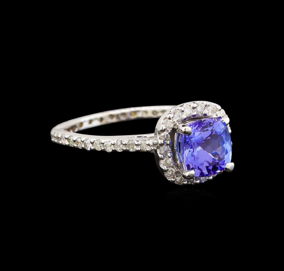 One electronically tested 14KT white gold ladies cast tanzanite and diamond ring with a flat shank with a bright polish finish. Trademark is Orianne. Identified with markings of "14K". Condition is new. Containing: One prong set square cushion modified brilliant cut natural tanzanite, measuring 6.00 x 6.00 x 3.90mm, approximate weight of 1.11ct., clarity is eye clean, type I, medium, very slightly grayish, violet color, (GIA V 5/3), cut is good. Fifty-Six prong set round brilliant cut diamonds, measuring 1.20 - 1.20 x 0.72mm (depth est.) approximate total weight of 56 Stones = 0.35ct. Clarity: SI-2 to I-2. Color: I - J, Cut is Good. All diamonds and colored gemstones are graded in the mounting, unless otherwise stated. Colored gemstones are presumed to have been subjected to commonly used enhancement processes.. Total Weight of Colored Stones 1.11ct. Total Weight of Diamonds 0.35ct. Total Weight of Ring 2.60 grams. GGL Appraised.