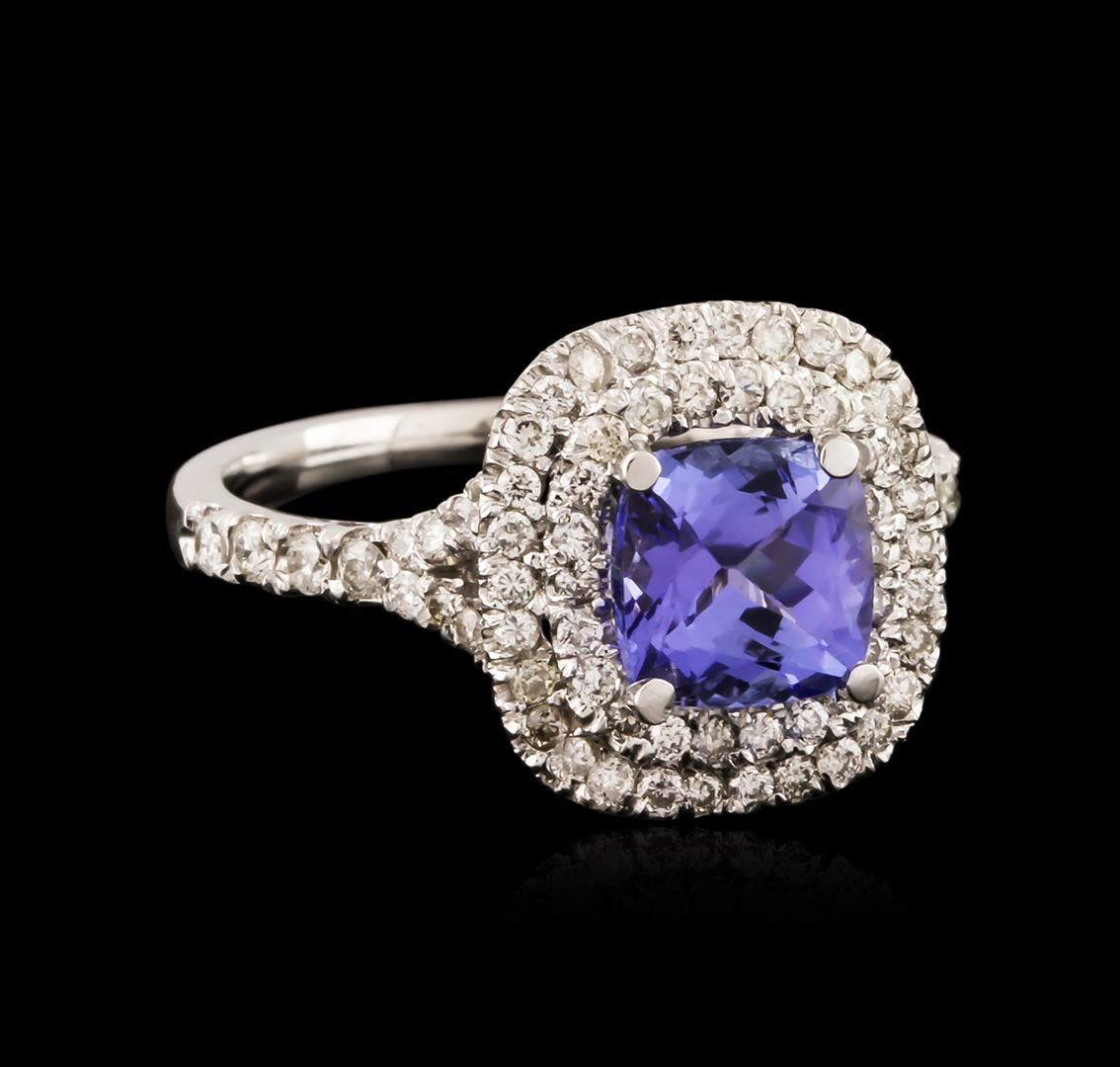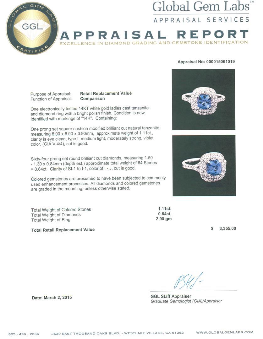 One electronically tested 14KT white gold ladies cast tanzanite and diamond ring with a bright polish finish. Identified with markings of "14K". Condition is new. Containing: One prong set square cushion modified brilliant cut natural tanzanite, measuring 6.00 x 6.00 x 3.90mm, approximate weight of 1.11ct., clarity is eye clean, type I, medium light, moderately strong, violet color, (GIA V 4/4), cut is good. Sixty-Four prong set round brilliant cut diamonds, measuring 1.50 - 1.30 x 0.84mm (depth est.) approximate total weight of 64 Stones = 0.64ct. Clarity: SI-1 to I-1. Color: I - J, Cut is Good. Colored gemstones are presumed to have been subjected to commonly used enhancement processes. All diamonds and colored gemstones are graded in the mounting, unless otherwise stated. Total Weight of Colored Stones 1.11ct. Total Weight of Diamonds 0.64ct. Total Weight of Ring 2.90 grams. GGL Appraised at $3,355.00.