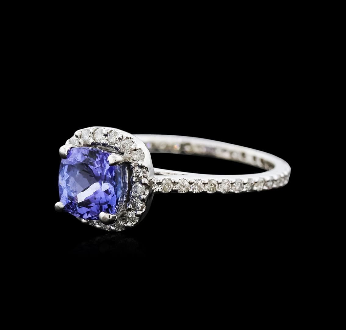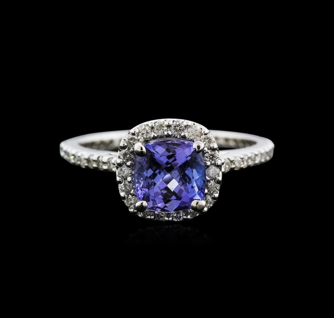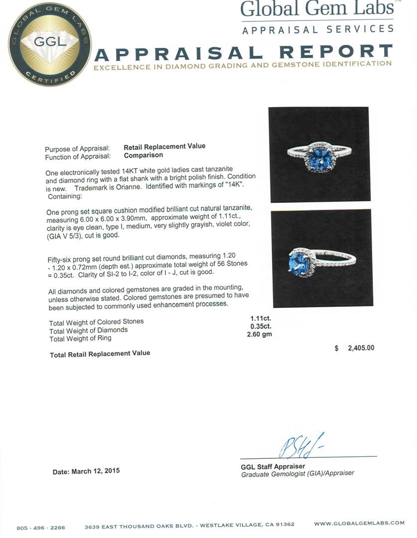 One electronically tested 14KT white gold ladies cast tanzanite and diamond ring with a flat shank with a bright polish finish. Trademark is Orianne. Identified with markings of "14K". Condition is new. Containing: One prong set square cushion modified brilliant cut natural tanzanite, measuring 6.00 x 6.00 x 3.90mm, approximate weight of 1.11ct., clarity is eye clean, type I, medium, very slightly grayish, violet color, (GIA V 5/3), cut is good. Fifty-Six prong set round brilliant cut diamonds, measuring 1.20 - 1.20 x 0.72mm (depth est.) approximate total weight of 56 Stones = 0.35ct. Clarity: SI-2 to I-2. Color: I - J, Cut is Good. All diamonds and colored gemstones are graded in the mounting, unless otherwise stated. Colored gemstones are presumed to have been subjected to commonly used enhancement processes.. Total Weight of Colored Stones 1.11ct. Total Weight of Diamonds 0.35ct. Total Weight of Ring 2.60 grams. GGL Appraised at $2,405.00.