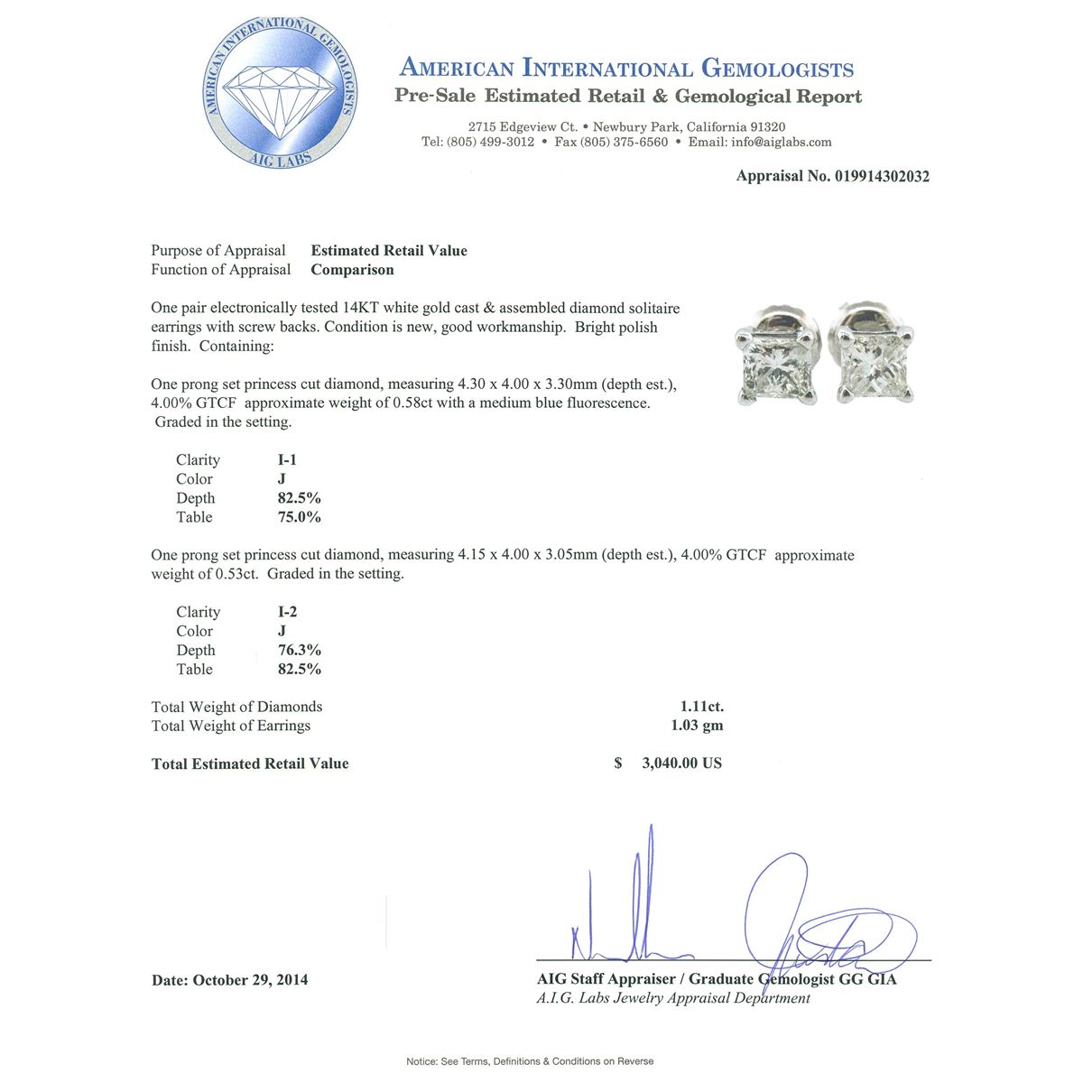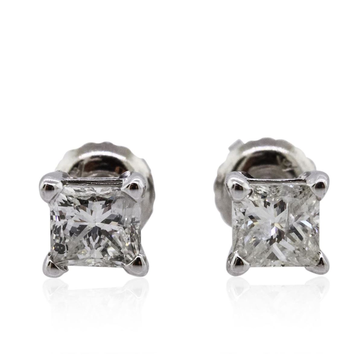One pair electronically tested 14KT white gold cast & assembled diamond solitaire earrings with screw backs. Bright polish finish. Condition is new, good workmanship. Containing: One prong set princess cut diamond, measuring 4.30 x 4.00 x 3.30mm (depth est.), 4.00.%. GTCF approximate weight of 0.58ct with a medium blue fluorescence. Graded in the setting. Clarity: I-1. Color: 82.5%. Table 75.0%. One prong set princess cut diamond, measuring 4.15 x 4.00 x 3.05mm (depth est.), 4.00.%. GTCF approximate weight of 0.53ct. Graded in the setting. Clarity: I-2. Color: 76.3%. Table 82.5%. Total Weight of Diamonds 1.11ct. Total Weight of Earrings 1.03 grams. AIG Appraised at $3,040.00.