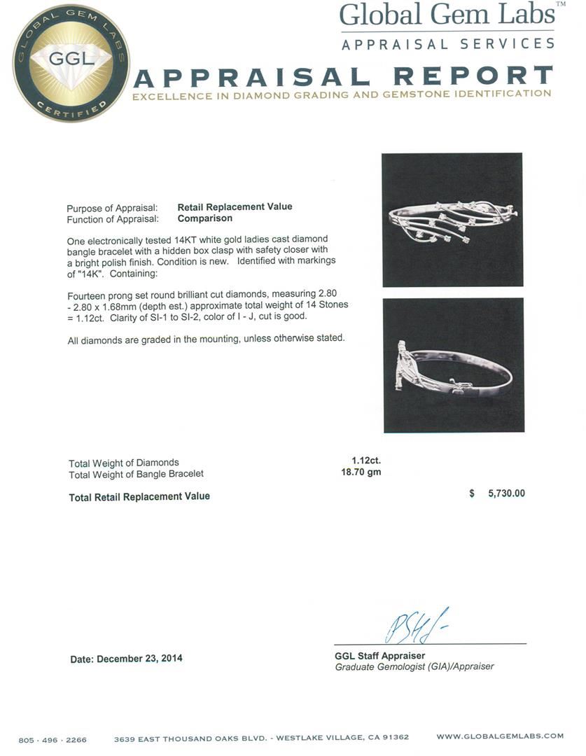 One electronically tested 14KT white gold ladies cast diamond bangle bracelet with a hidden box clasp with safety closer with a bright polish finish. Identified with markings of "14K". Condition is new. Containing: Fourteen prong set round brilliant cut diamonds, measuring 2.80 - 2.80 x 1.68mm (depth est.) approximate total weight of 14 Stones = 1.12ct. Clarity: SI-1 to SI-2. Color: I - J, Cut is Good. All diamonds are graded in the mounting, unless otherwise stated. Total Weight of Diamonds 1.12ct. Total Weight of Bangle Bracelet 18.70 grams. GGL Appraised.