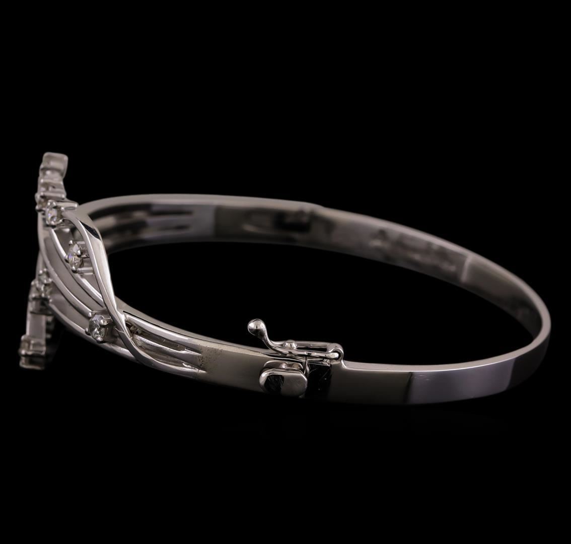 One electronically tested 14KT white gold ladies cast diamond bangle bracelet with a hidden box clasp with safety closer with a bright polish finish. Identified with markings of "14K". Condition is new. Containing: Fourteen prong set round brilliant cut diamonds, measuring 2.80 - 2.80 x 1.68mm (depth est.) approximate total weight of 14 Stones = 1.12ct. Clarity: SI-1 to SI-2. Color: I - J, Cut is Good. All diamonds are graded in the mounting, unless otherwise stated. Total Weight of Diamonds 1.12ct. Total Weight of Bangle Bracelet 18.70 grams. GGL Appraised.