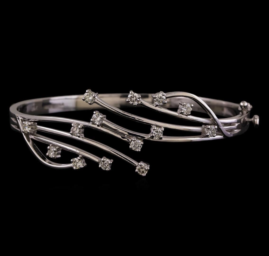 One electronically tested 14KT white gold ladies cast diamond bangle bracelet with a hidden box clasp with safety closer with a bright polish finish. Identified with markings of "14K". Condition is new. Containing: Fourteen prong set round brilliant cut diamonds, measuring 2.80 - 2.80 x 1.68mm (depth est.) approximate total weight of 14 Stones = 1.12ct. Clarity: SI-1 to SI-2. Color: I - J, Cut is Good. All diamonds are graded in the mounting, unless otherwise stated. Total Weight of Diamonds 1.12ct. Total Weight of Bangle Bracelet 18.70 grams. GGL Appraised.