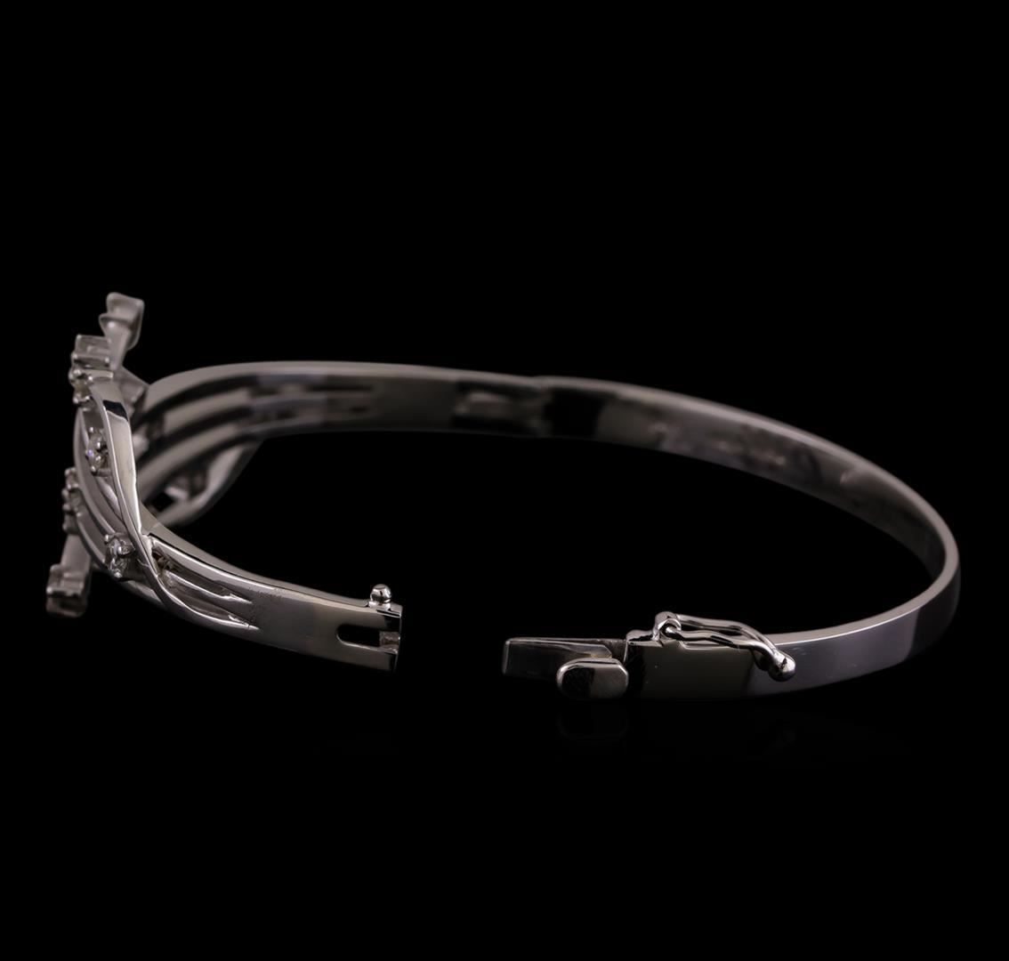 One electronically tested 14KT white gold ladies cast diamond bangle bracelet with a hidden box clasp with safety closer with a bright polish finish. Identified with markings of "14K". Condition is new. Containing: Fourteen prong set round brilliant cut diamonds, measuring 2.80 - 2.80 x 1.68mm (depth est.) approximate total weight of 14 Stones = 1.12ct. Clarity: SI-1 to SI-2. Color: I - J, Cut is Good. All diamonds are graded in the mounting, unless otherwise stated. Total Weight of Diamonds 1.12ct. Total Weight of Bangle Bracelet 18.70 grams. GGL Appraised.