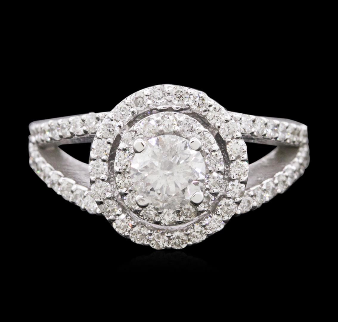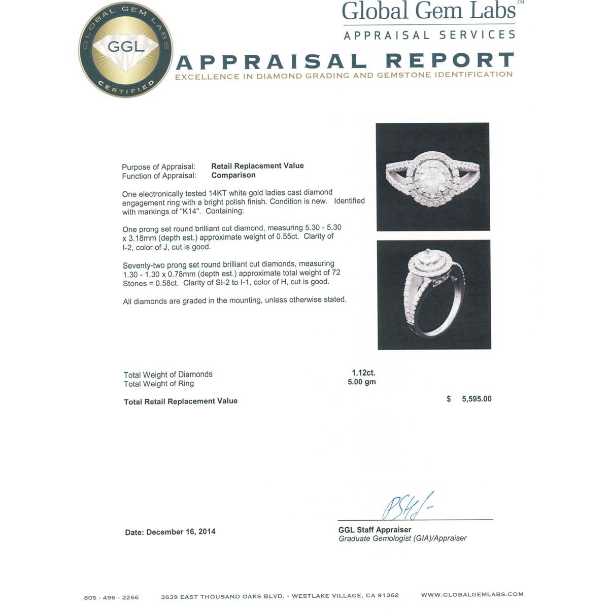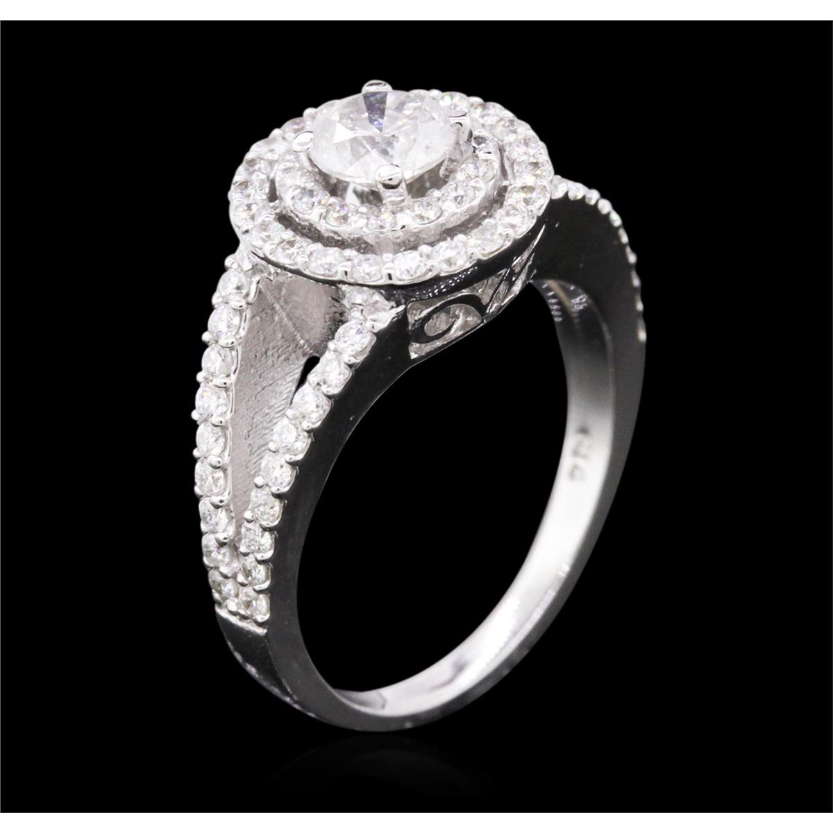 One electronically tested 14KT white gold ladies cast diamond engagement ring with a bright polish finish. Identified with markings of "K14". Condition is new. Containing: One prong set round brilliant cut diamond, measuring 5.30 - 5.30 x 3.18mm (depth est.) approximate weight of 0.55ct. Clarity: I-2. Color: J, Cut is Good. Seventy-Two prong set round brilliant cut diamonds, measuring 1.30 - 1.30 x 0.78mm (depth est.) approximate total weight of 72 Stones = 0.58ct. Clarity: SI-2 to I-1. Color: H, Cut is Good. All diamonds are graded in the mounting, unless otherwise stated. Total Weight of Diamonds 1.12ct. Total Weight of Ring 5.00 grams. GGL Appraised at $5,595.00.